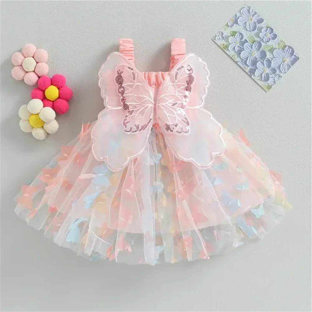 Summer Girl's Dress Sweet Suspender Wrap Waist Colorful Butterfly Mesh Back Big Wings Princess Skirt...