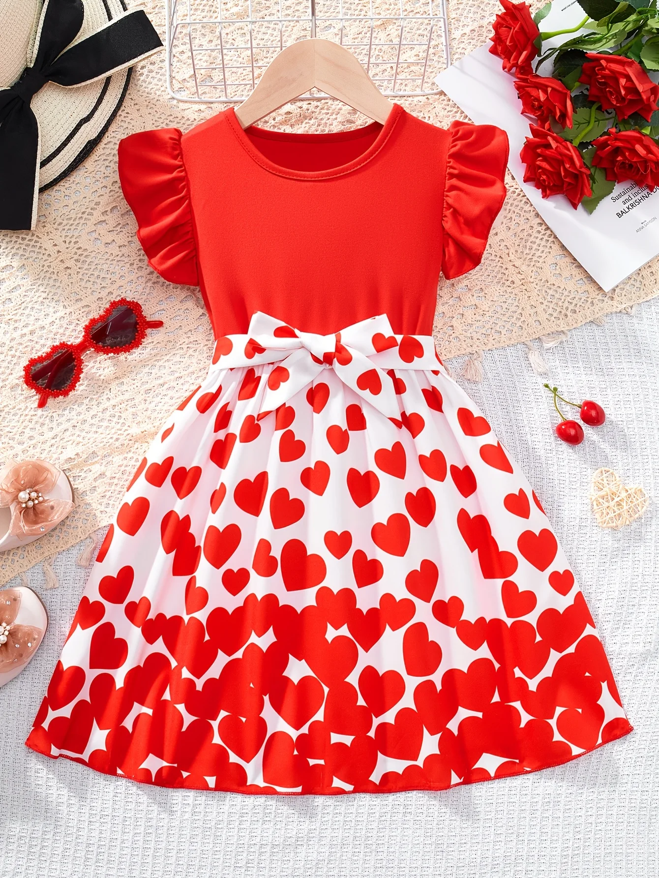 Girls' Dress with Heart Pattern Printed Patchwork Dress for Home Casual Outing Versatile Red Heart S...