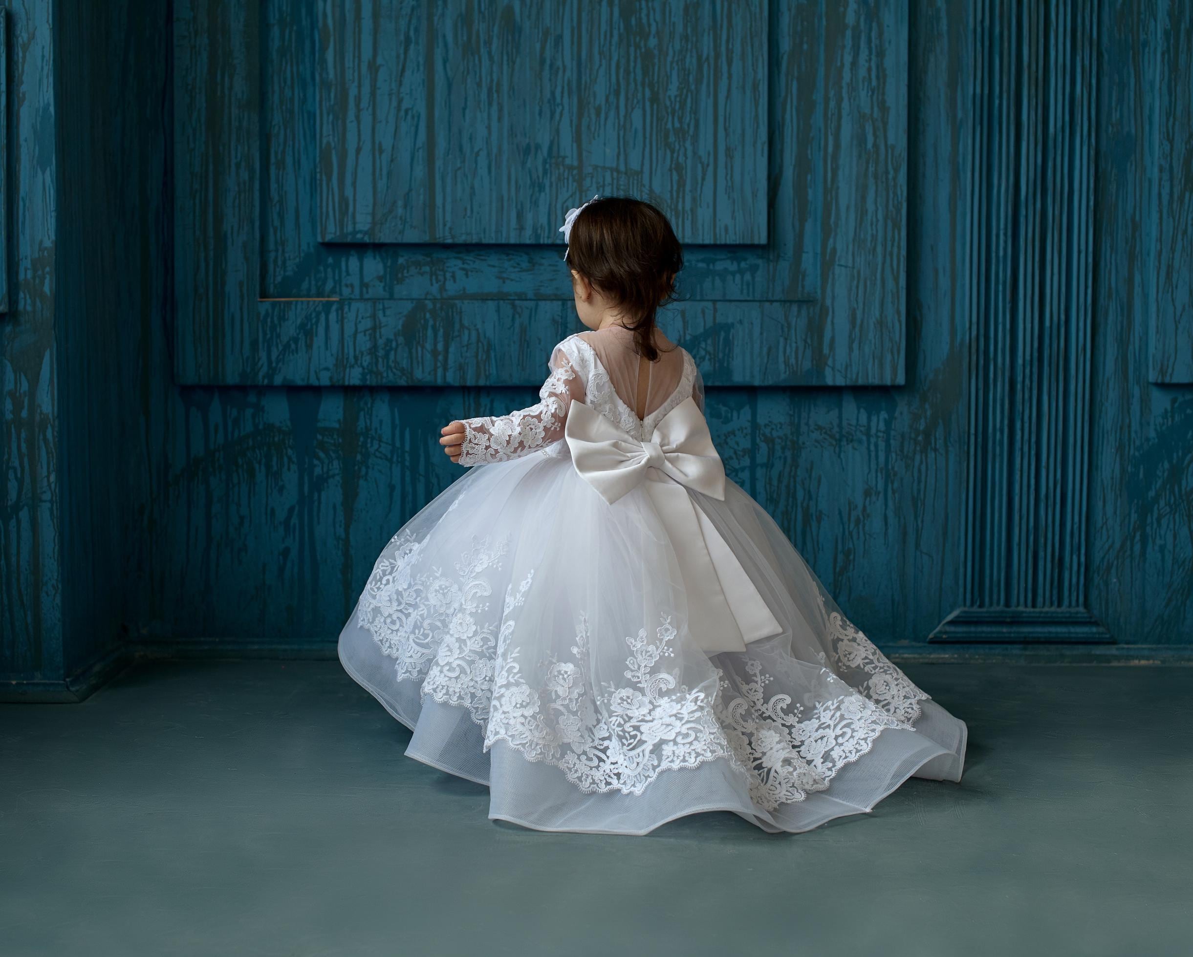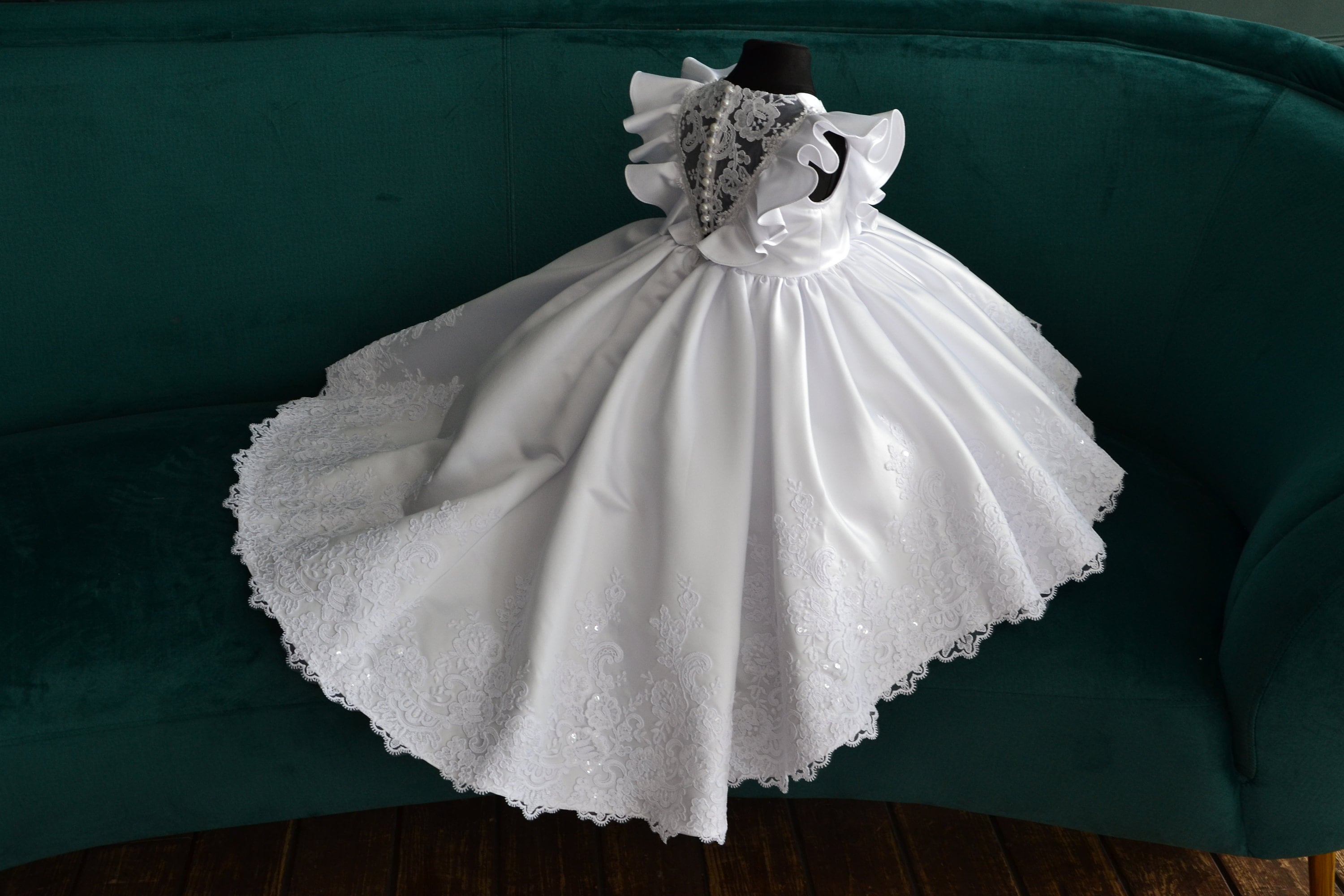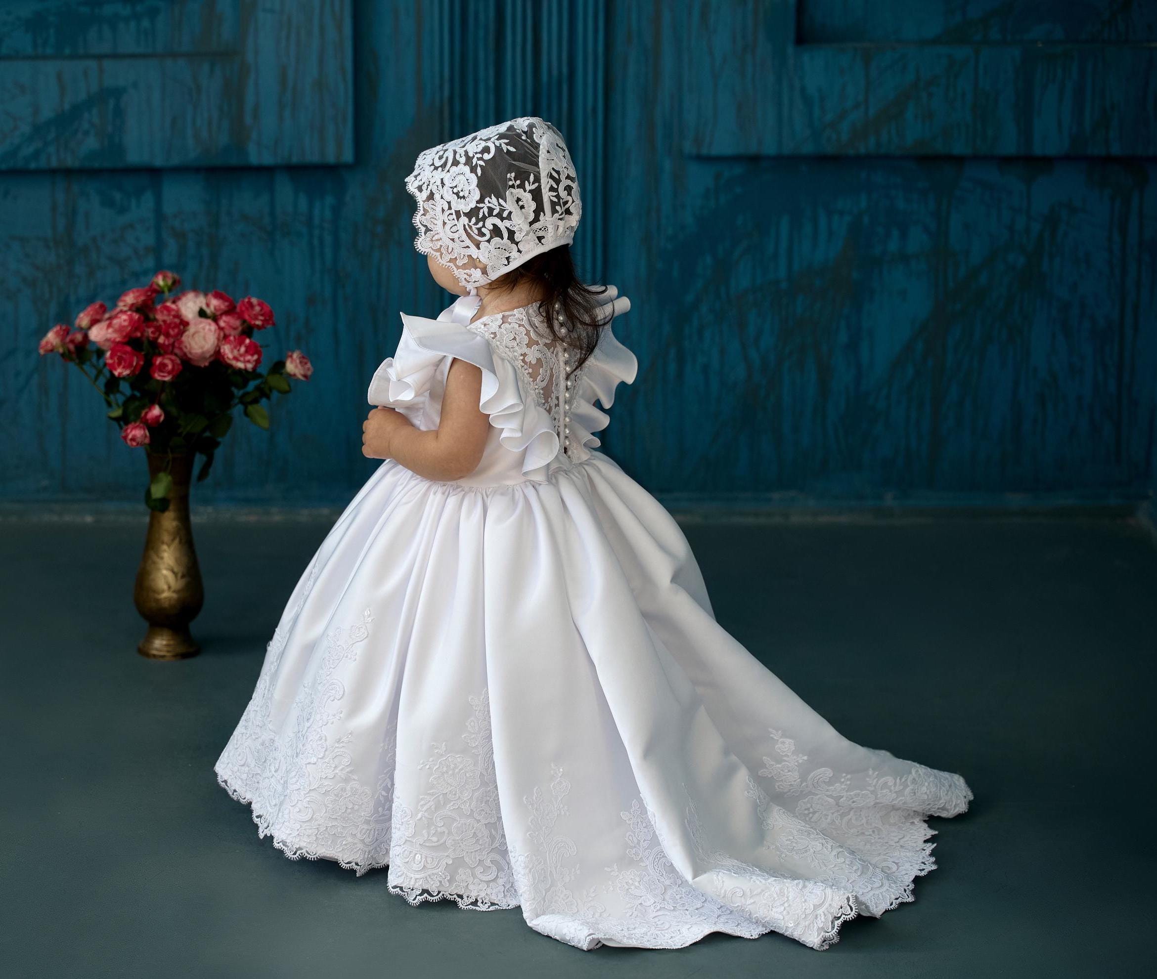 First communion dress for toddler girl with train, Baptism gown, Ho...
