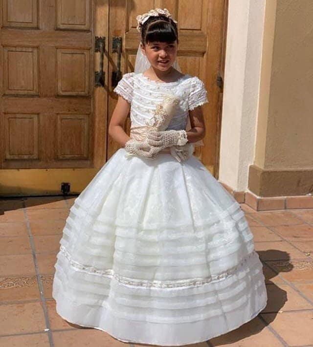 "Vestido de niña para Primera communion corte princessa con bordado de la Virgen Maria e...