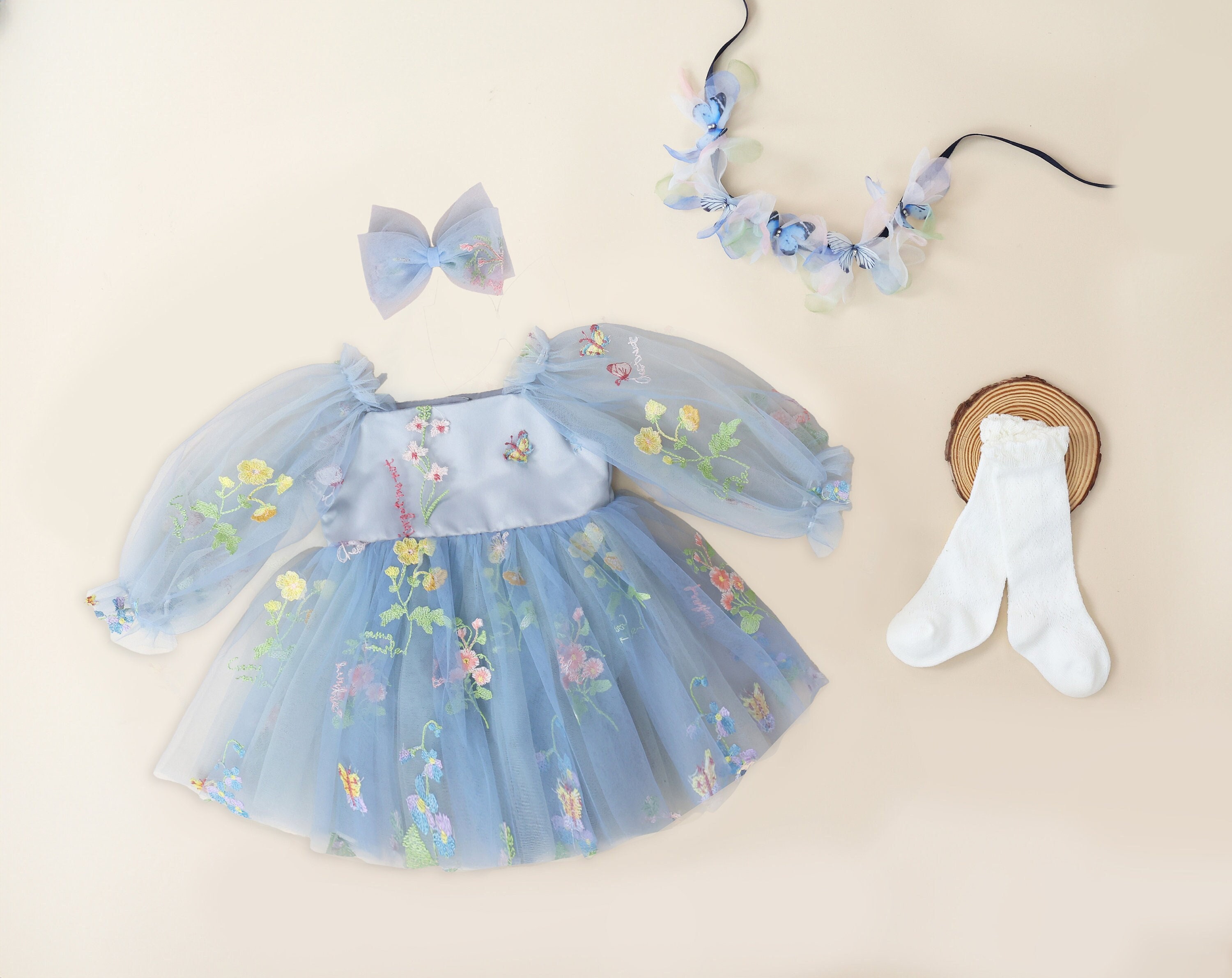 Dusty Blue Floral Embroidered Tulle Flower Girl Dress, Easter Girls...
