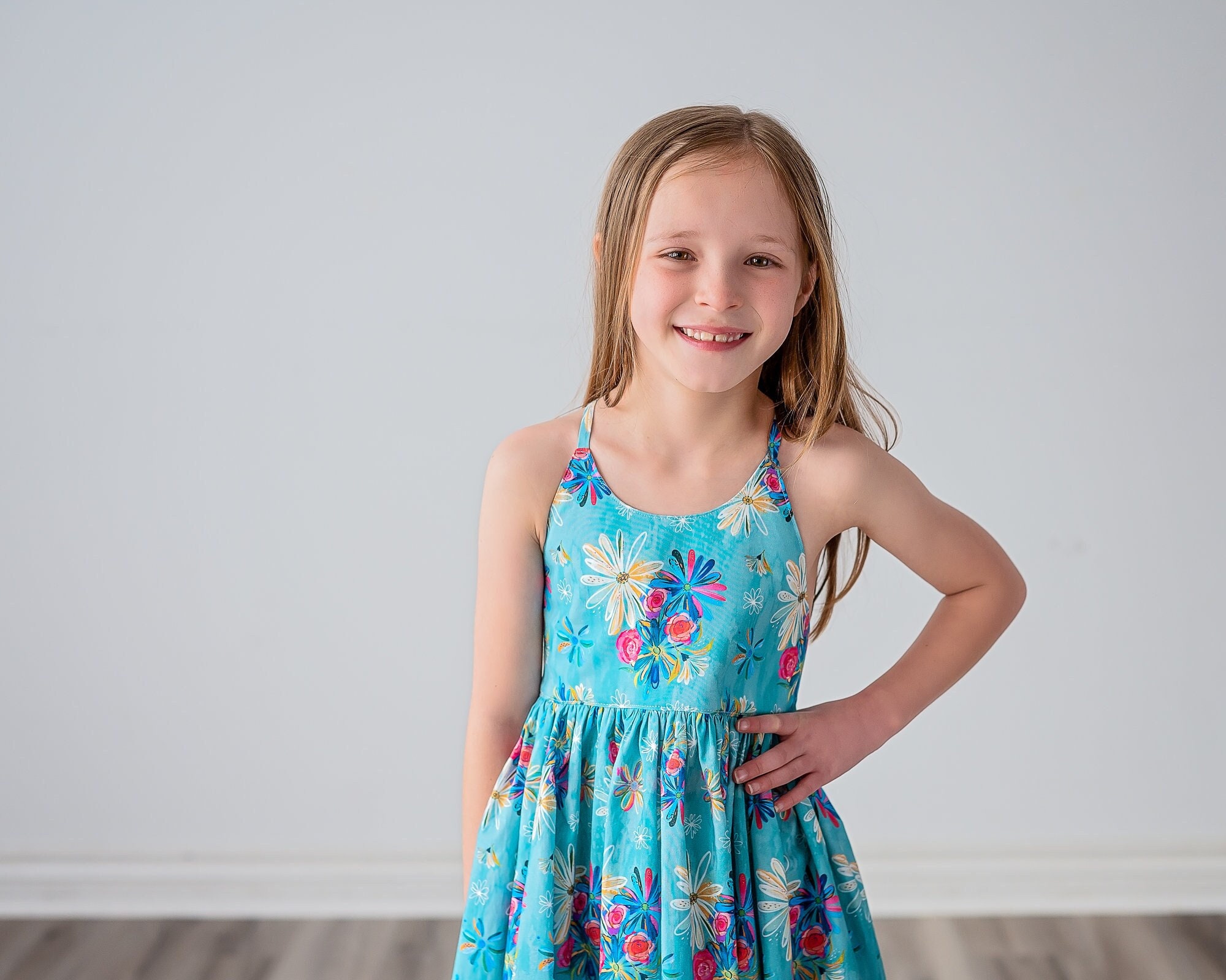 "Our girls maxi sun dress features a vibrant aqua blue floral print with pink flowers, a scoop ...