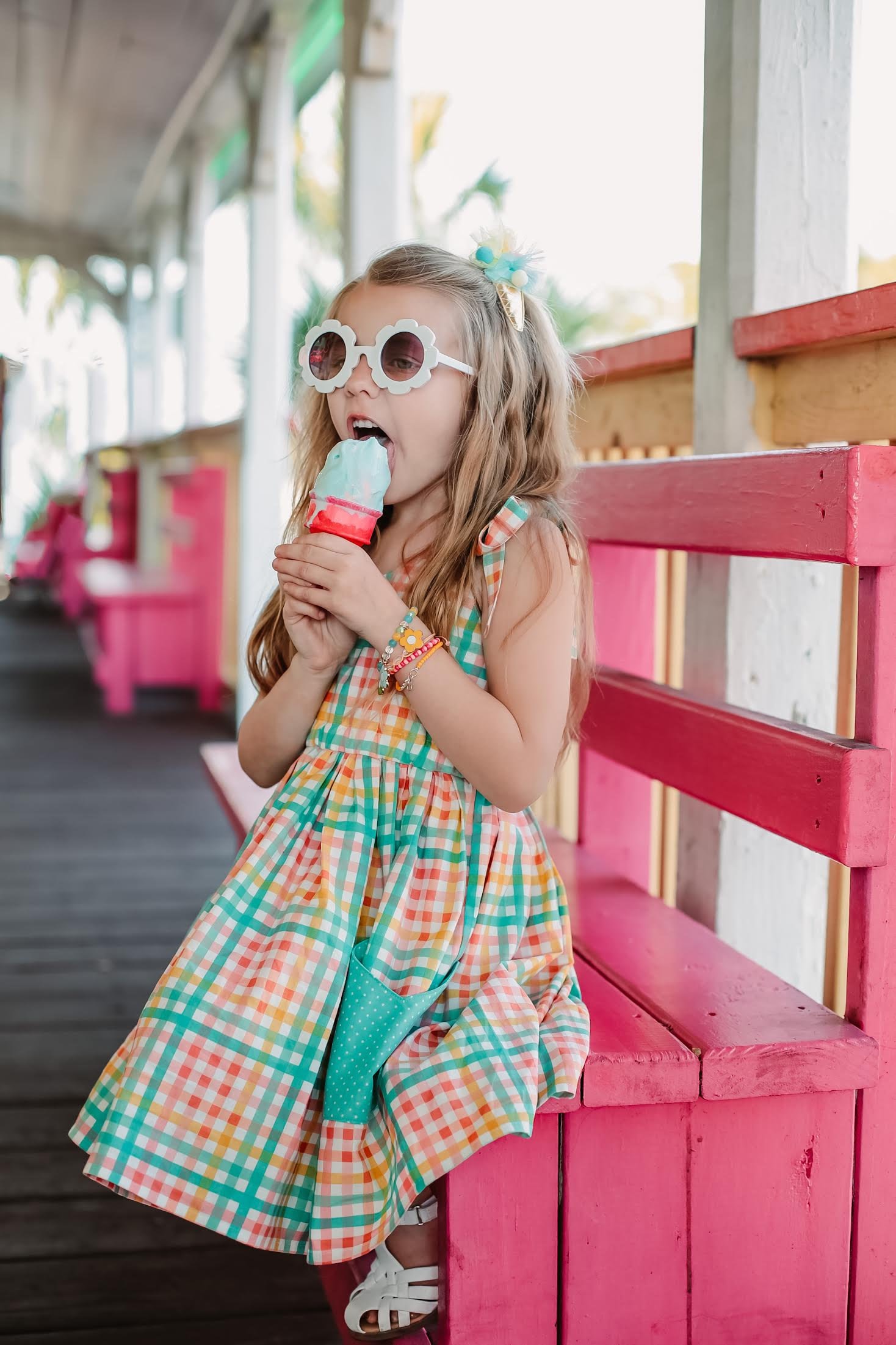 "MODEL LUCY IS AGE 5 (DECEMBER 2022) AND SHE IS WEARING THIS PASTEL MULTI GINGHAM DRESS IN A SI...