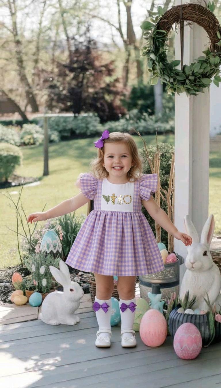 Sheep He Is Risen Easter Embroidered 3D Dress, Gingham Dress, Jesus...