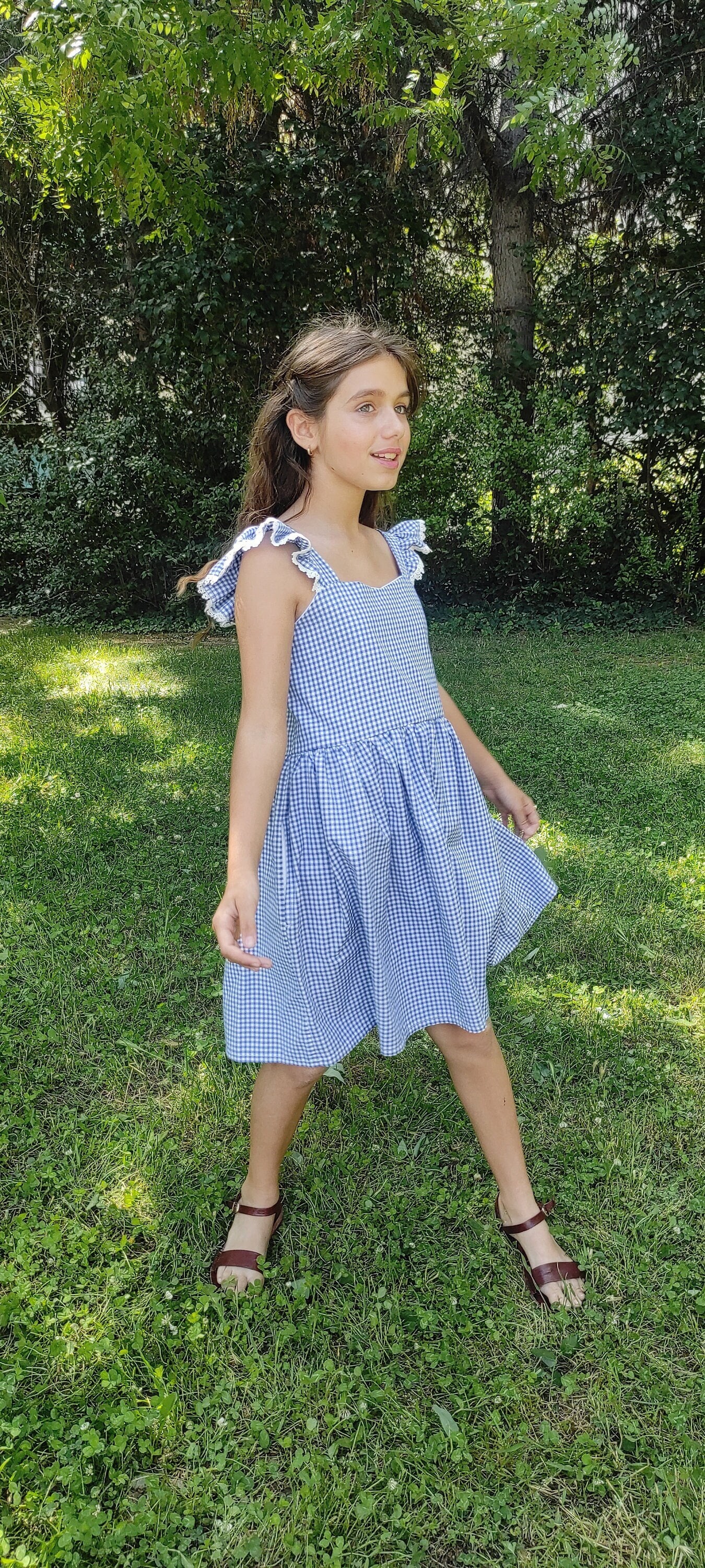 Hand made gingham dress, gingham school dress, blue gingham, ruffle...