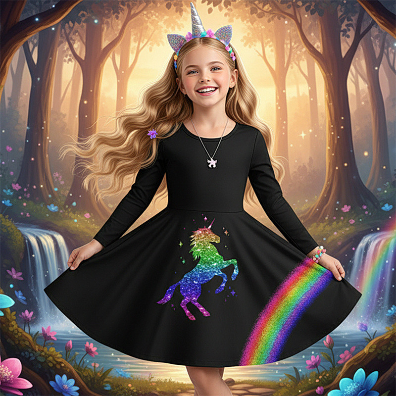 Girls' 3D Graphic Rainbow Unicorn Dress Long Sleeve 3D Print Spring...