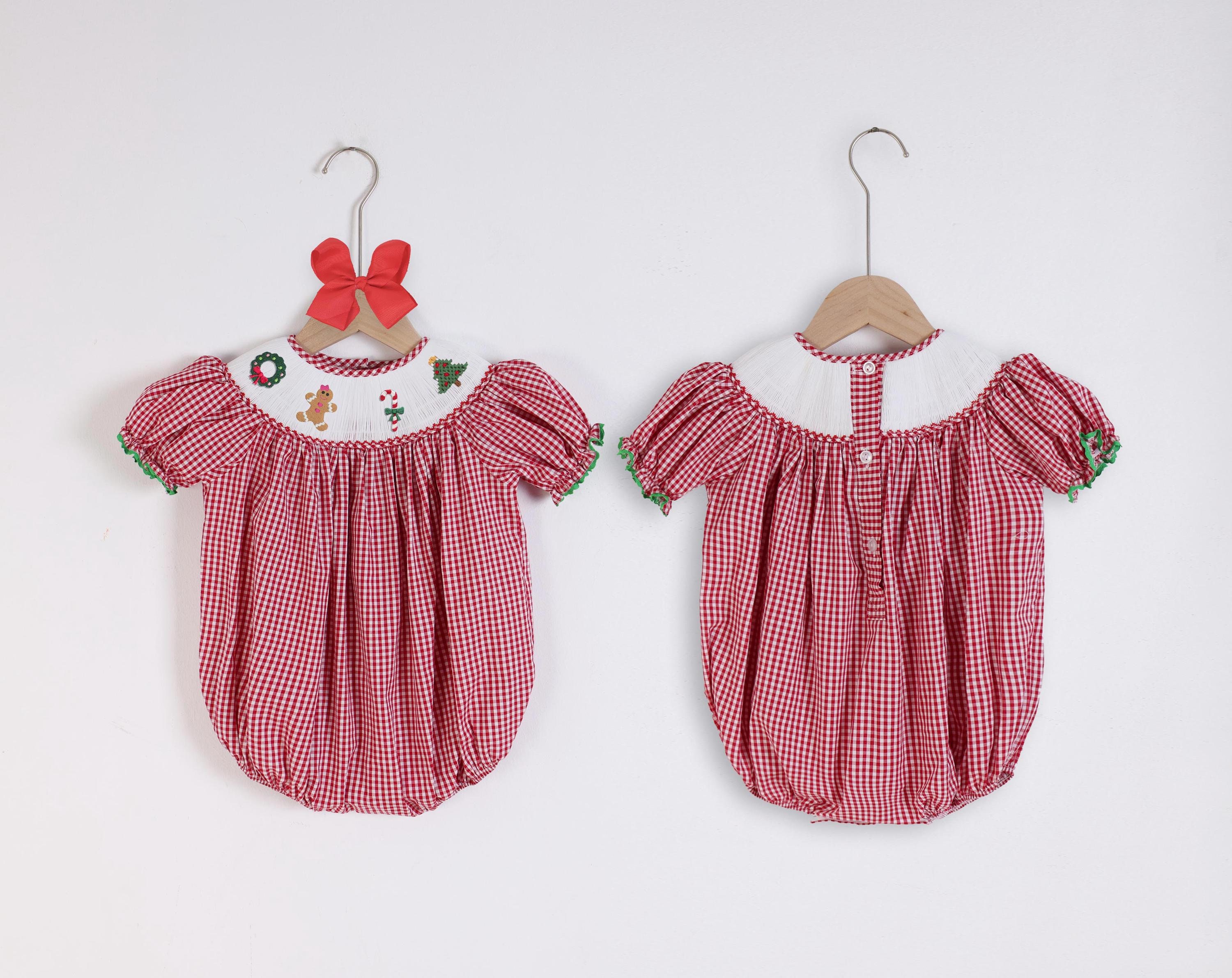 Red Gingham Christmas Smocked Embroidered Reindeer Bubble Outfit, G...