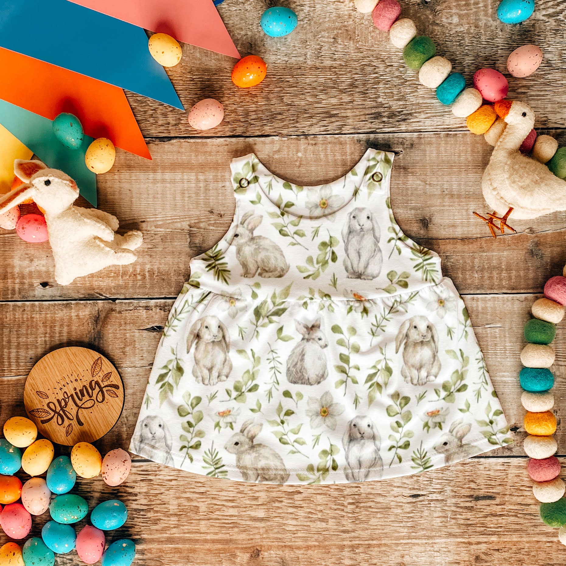 Girl pinafore dress, organic baby clothes, bunny toddler dress, bab...