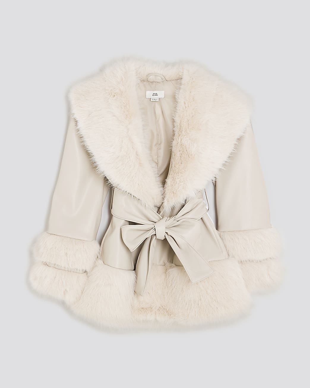 River Island Girls Wrap Coat Cream Faux Fur - Size 7-8Y | River Isl...