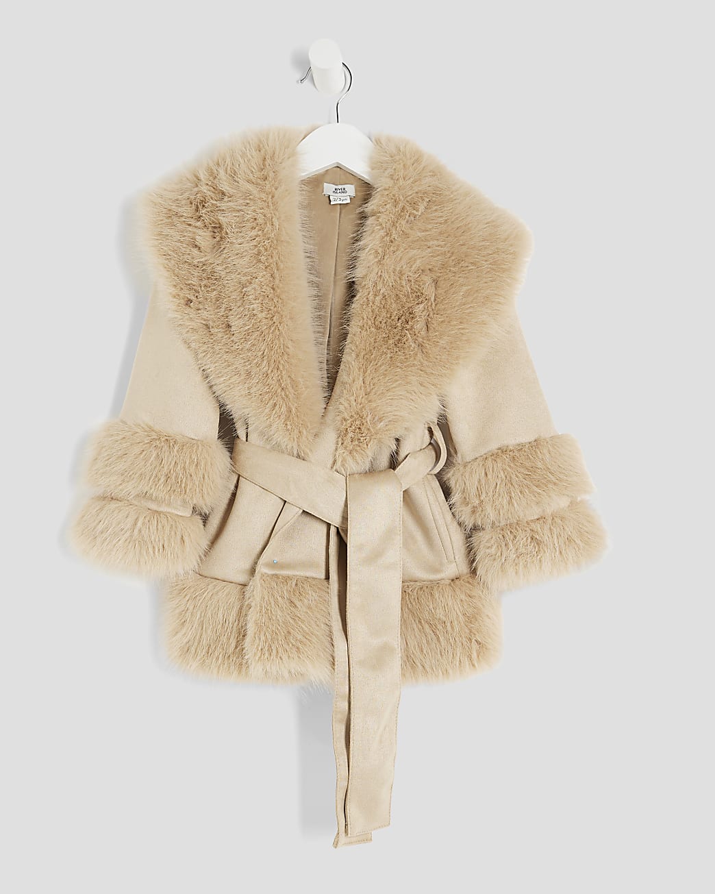 River Island Mini Girls Wrap Coat Beige Suedette Fur - Cream - Size...