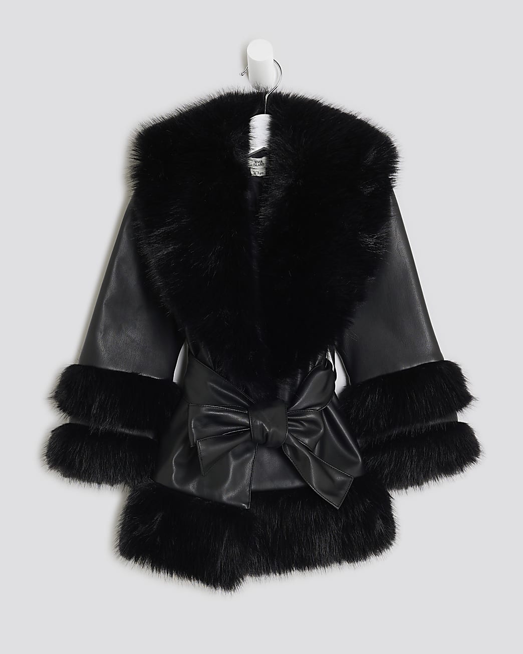 River Island Mini Girls Wrap Coat Black Faux Fur - Size 2-3Y | Rive...