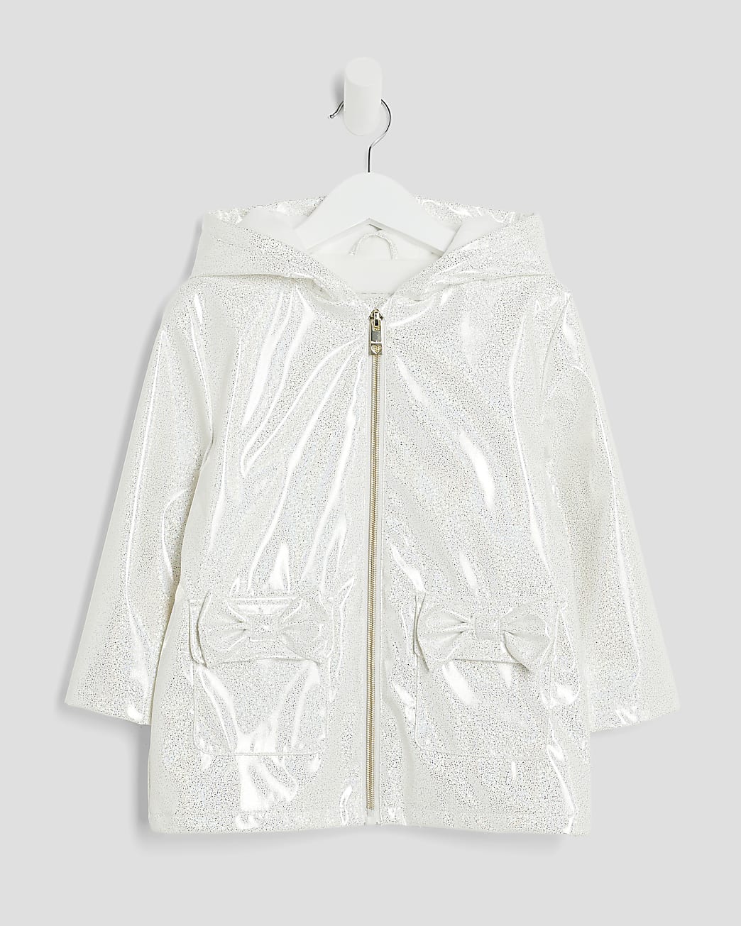 Hooded, Glitter style, Decorative bow pockets, Zipped fastening, Long sleeves, Shower resistant, Fle...