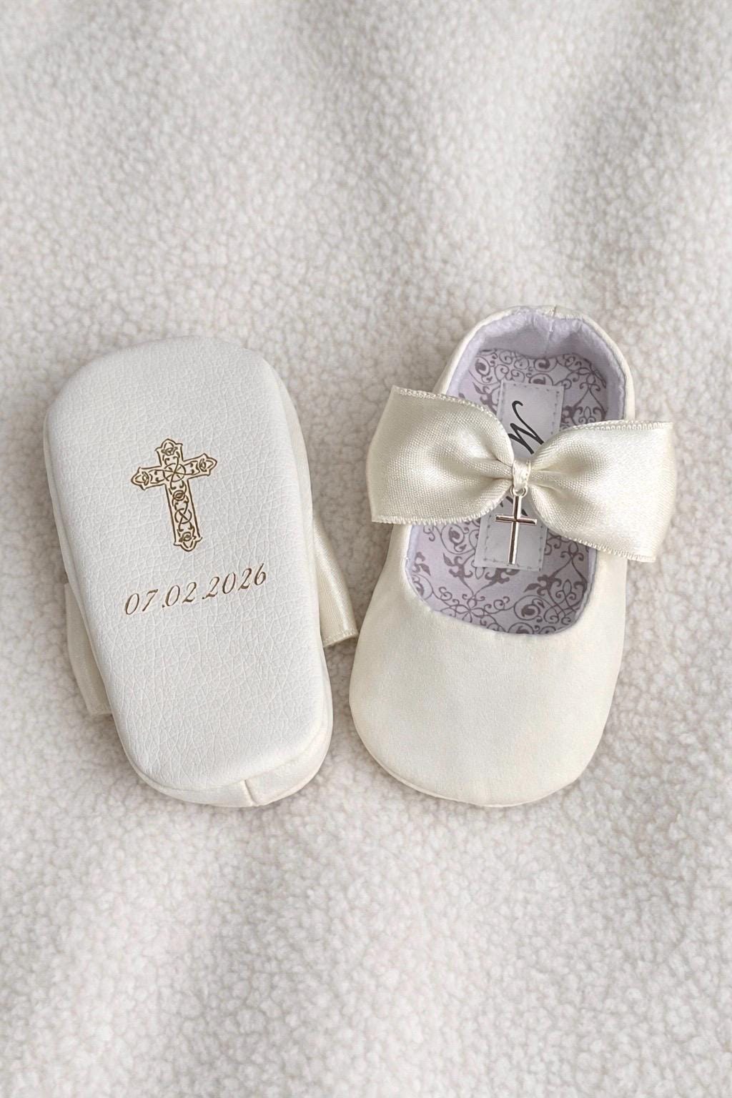 PERSONALISED ivory baptism shoes and bow headband, cross shoes, whi...