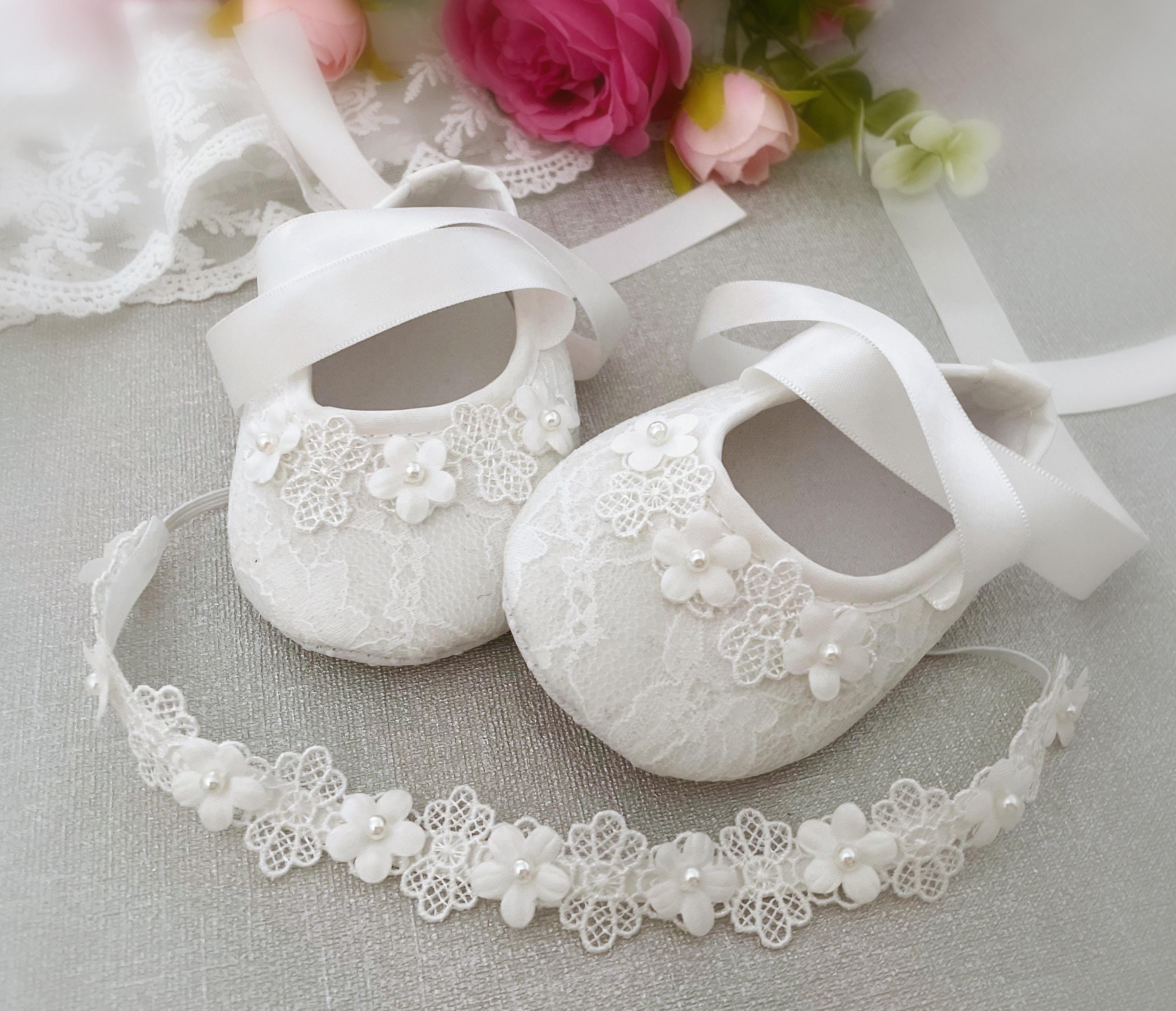 Lace Baby Shoes & Headband Set with Daisies and Pearls Dress your little one in timeless charm w...