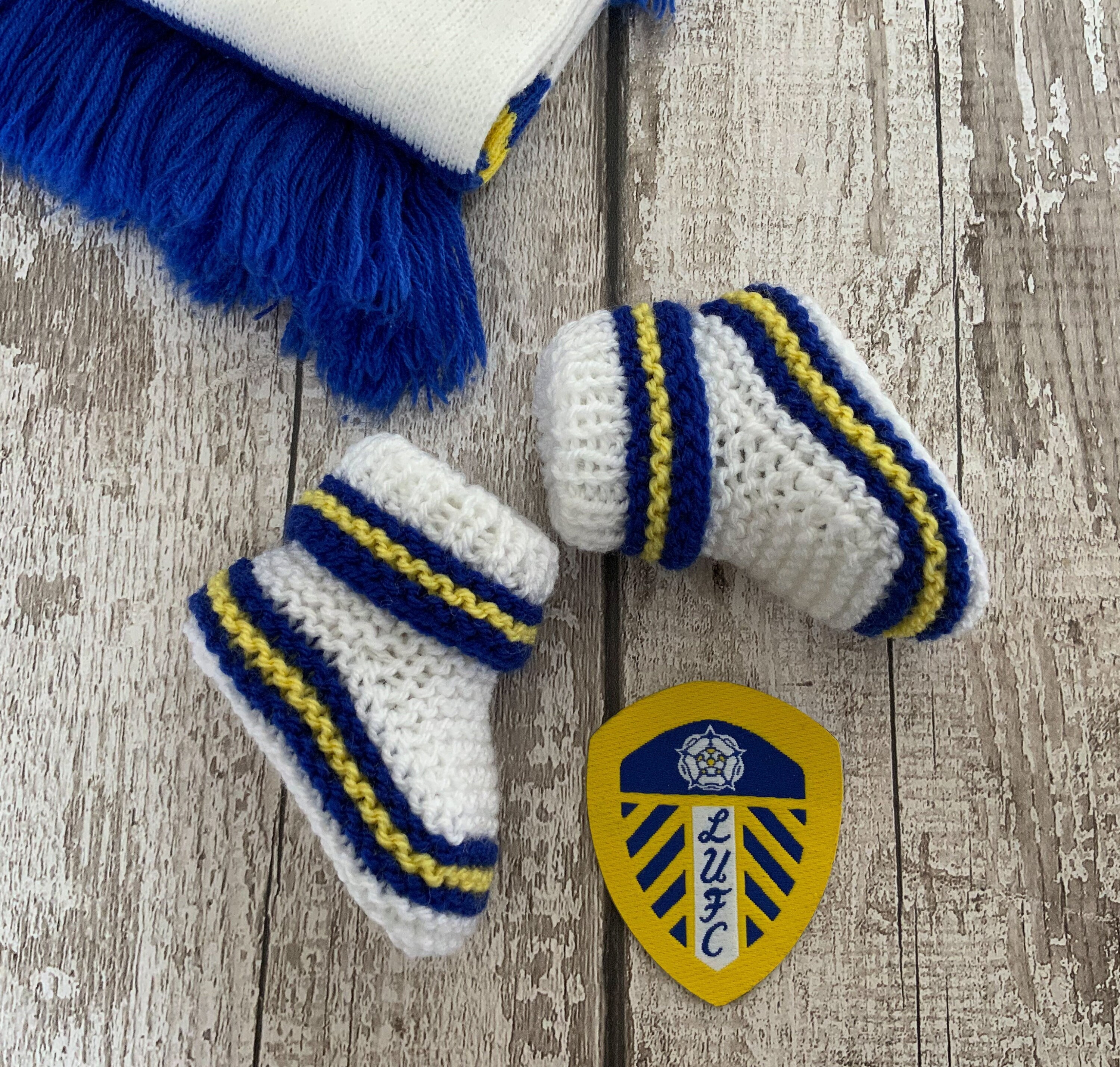 Leeds United Baby Booties. Newborn to 6 Months. Hand Knit Baby Boot...