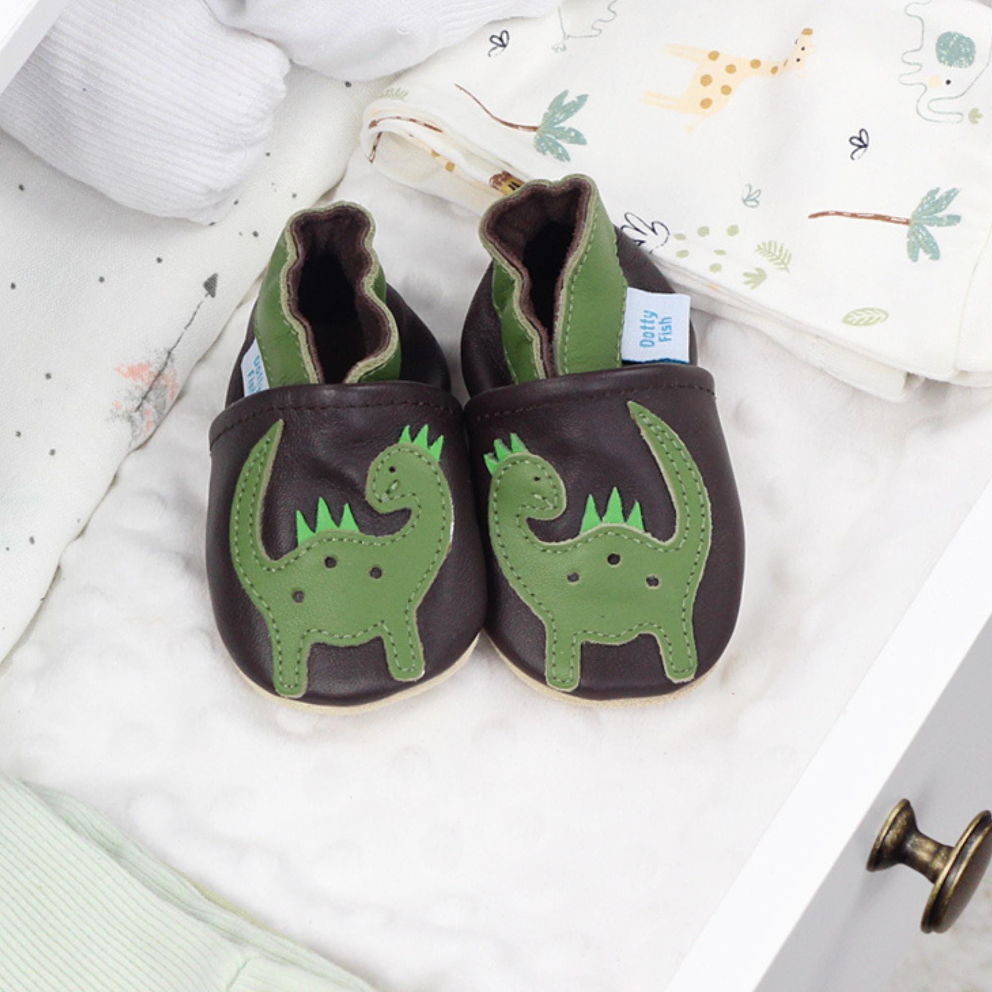 Rawr! Let your little dinosaur fan stomp in comfort with Dotty Fish Soft Leather Dinosaur Baby Shoes...