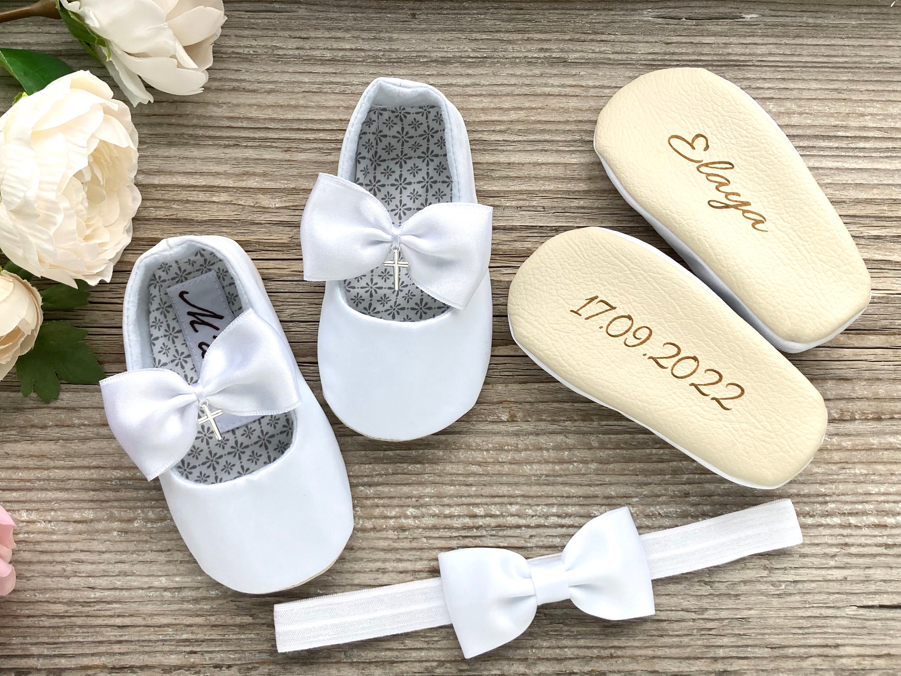PERSONALISED baptism shoes and bow headband, white cross shoes, whi...