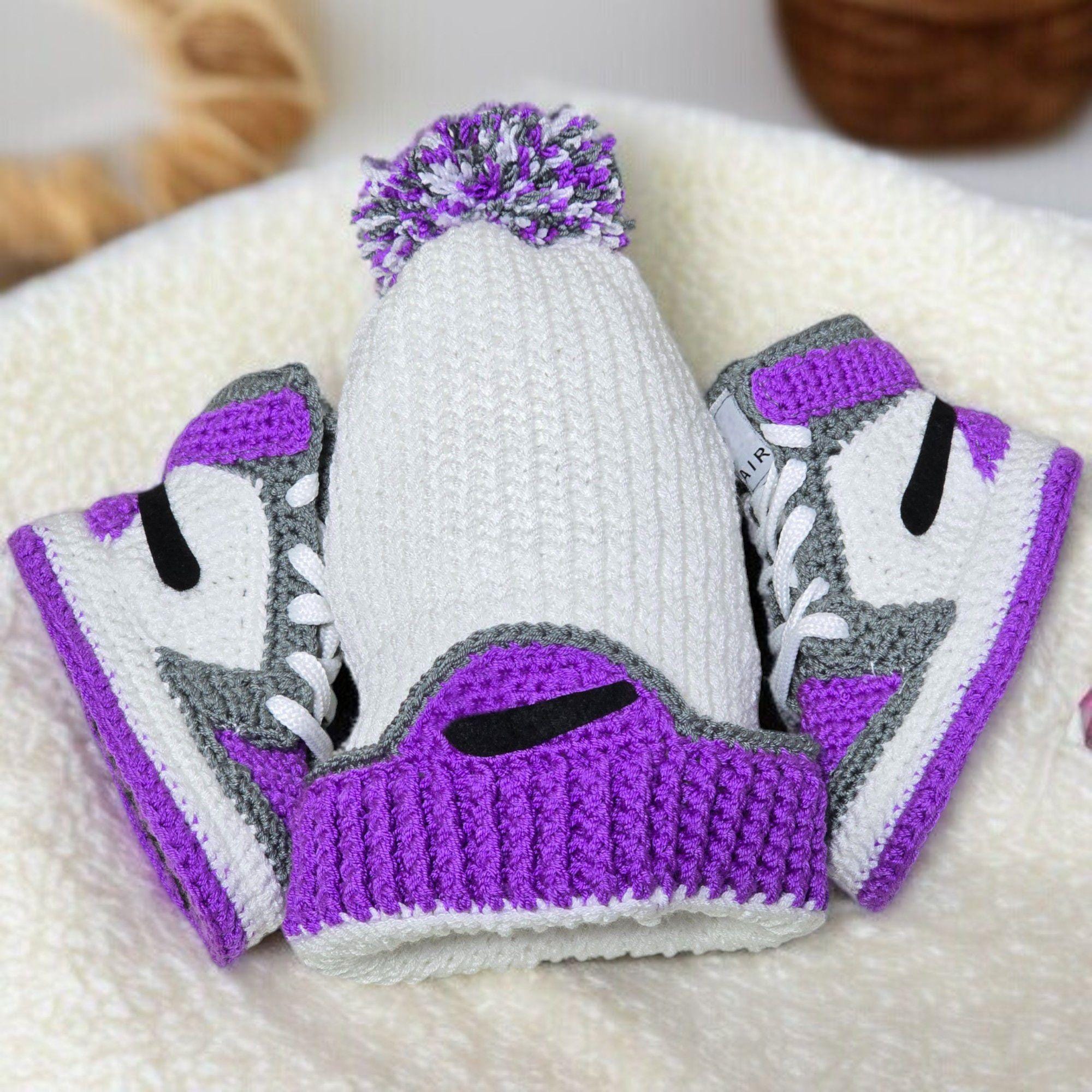 Crochet Baby Jordan Sneakers And Beanie Set | Purple Basketball Boo...