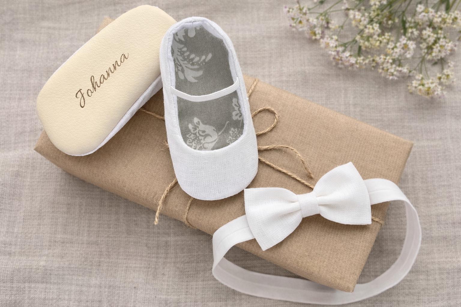 Personalised LINEN christening girl shoes and headband, white linen...