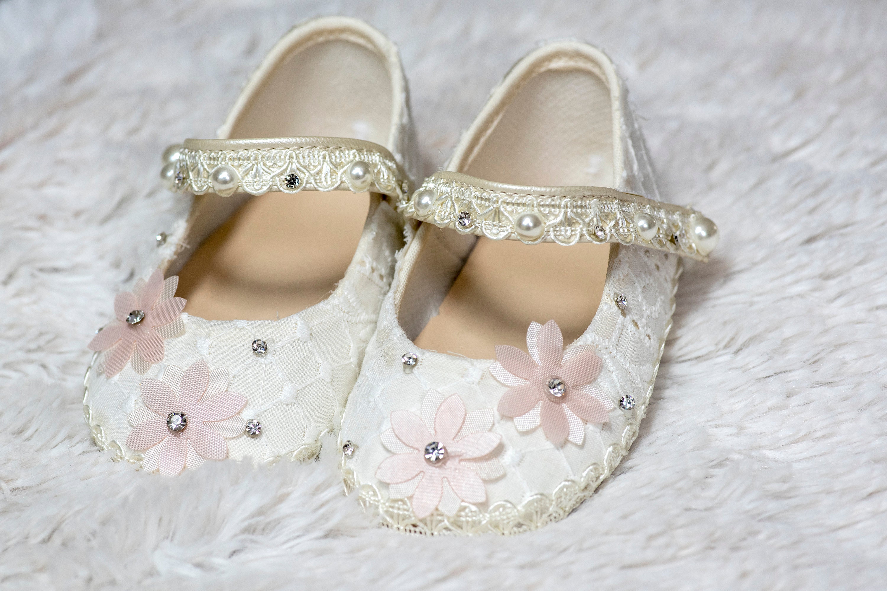 These beautiful baby girl shoes are decorated by hand with a lovely embellishment that will match th...