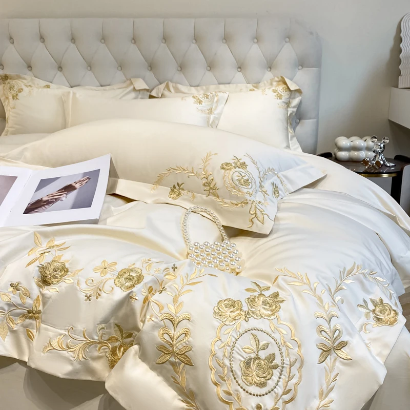 Golden Flowers Embroidery Bedding Set Luxury Beige Egyptian Cotton ...