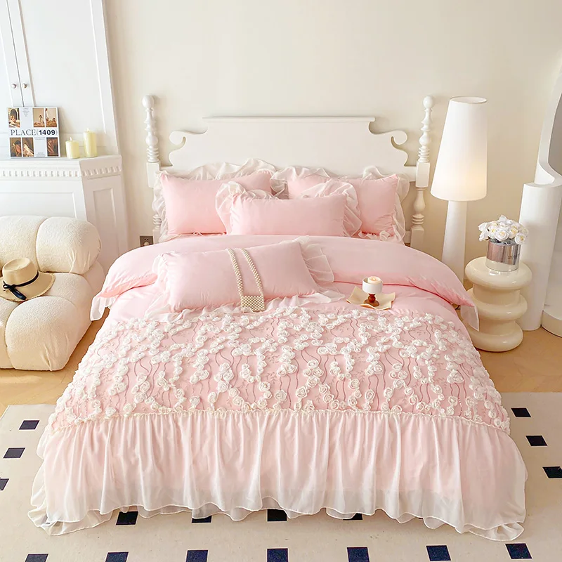 Pink Bedding Set with Lace for Girls Princess Style Duvet Cover Sets Lace Flower Bed Sheet Set Singl...