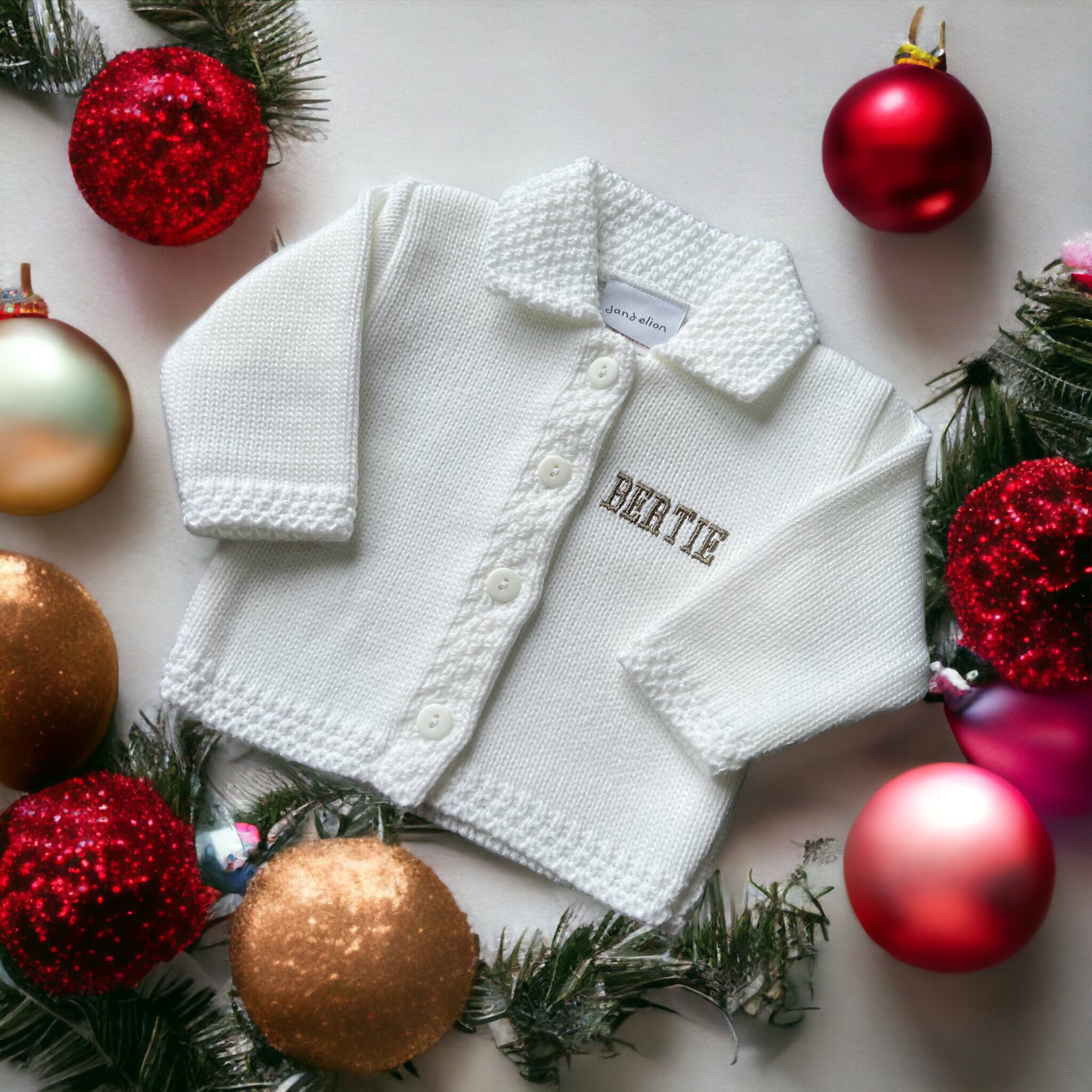 White knitted baby cardigan which can be Personalised. The cardigan is made of a lovely lightweight ...