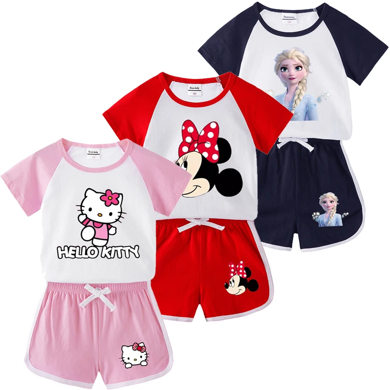 Hello Kitty Printed Kids Short Sleeve Suit 2024 Girls Summer Clothi...