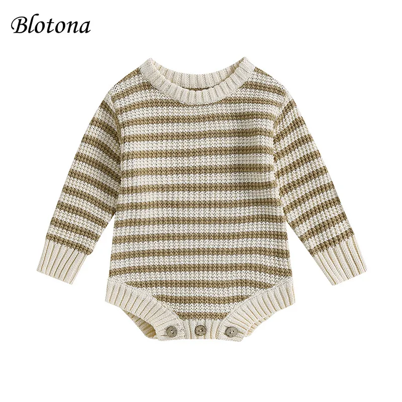 Blotona Newborn Baby Autumn Winter Striped Sweater Romper Khaki Long Sleeve Crew Neck Knitted Playsu...
