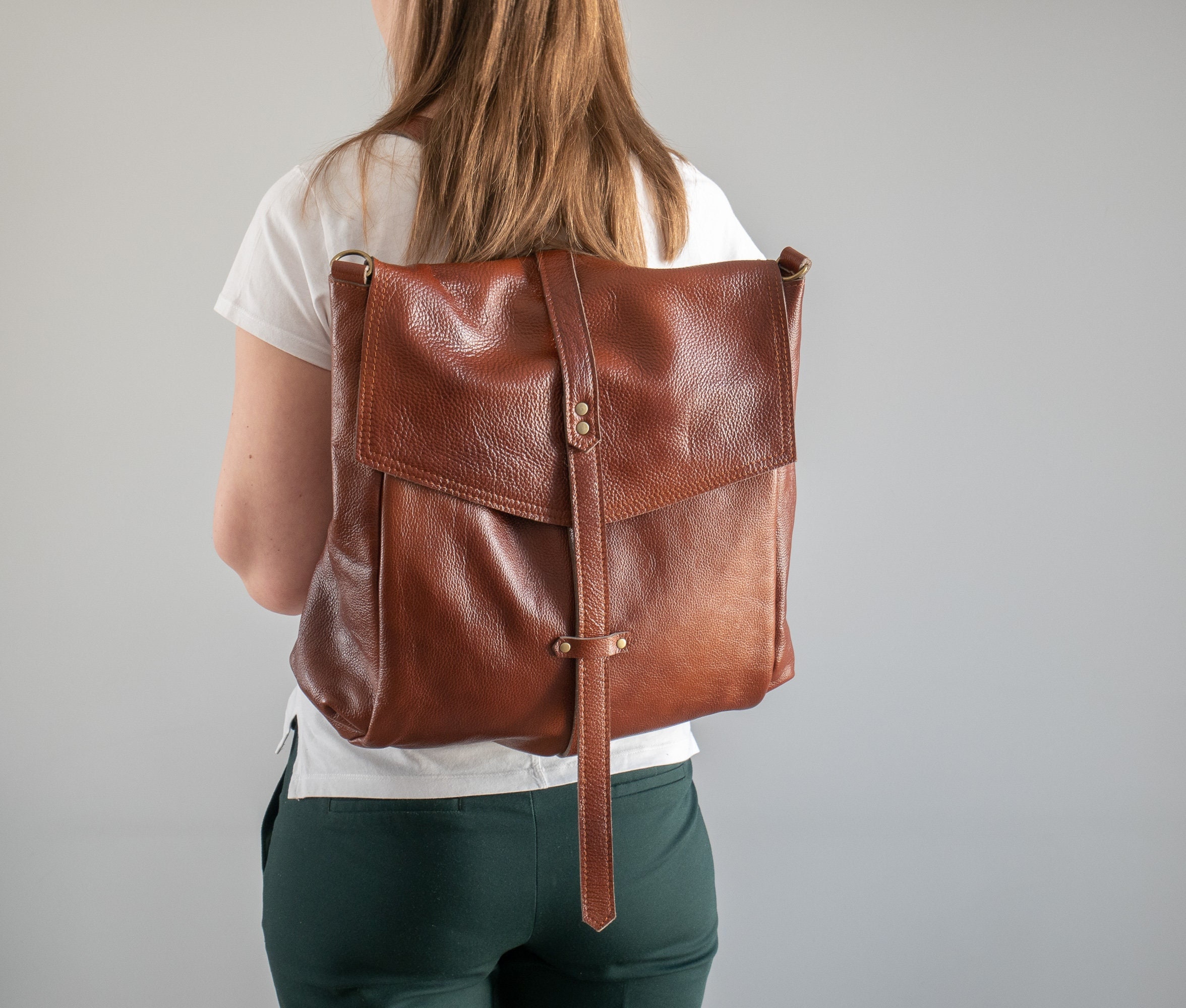 Cognac Brown Leather BACKPACK - Leather Rucksack - Backpack Purse -...