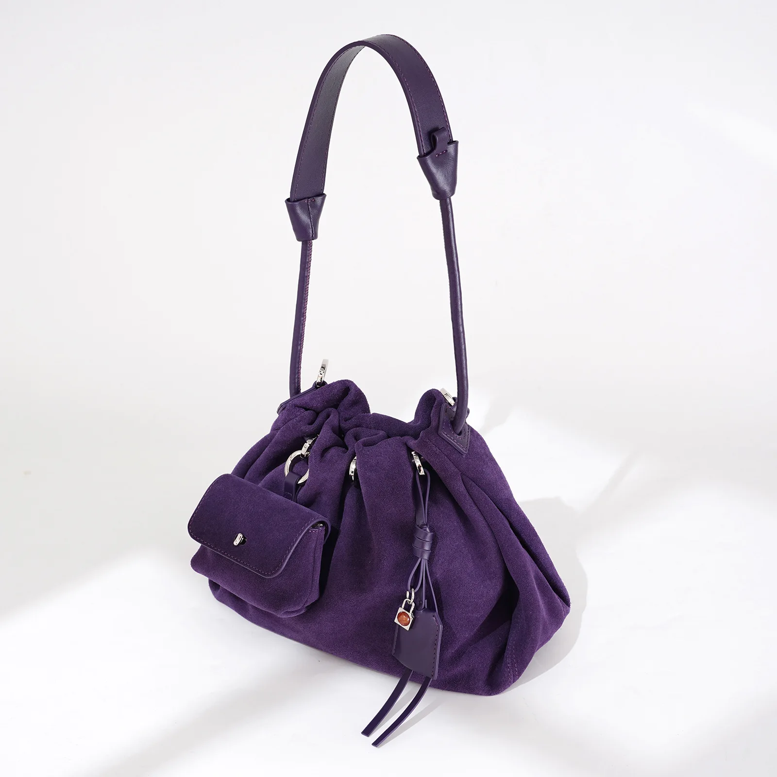 Natural grain leather Inside snap pocket Magnetic snap and drawstring closures Handle with 4" d...