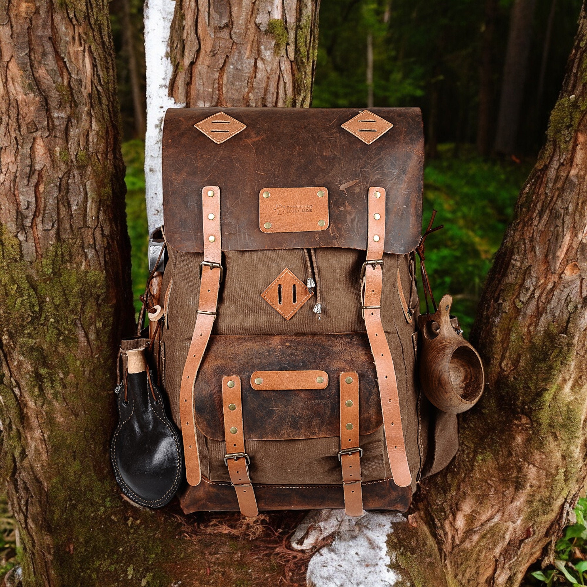 50L | Black-Brown-Green | Bushcraft Handmade Waxed Canvas Backpack ...