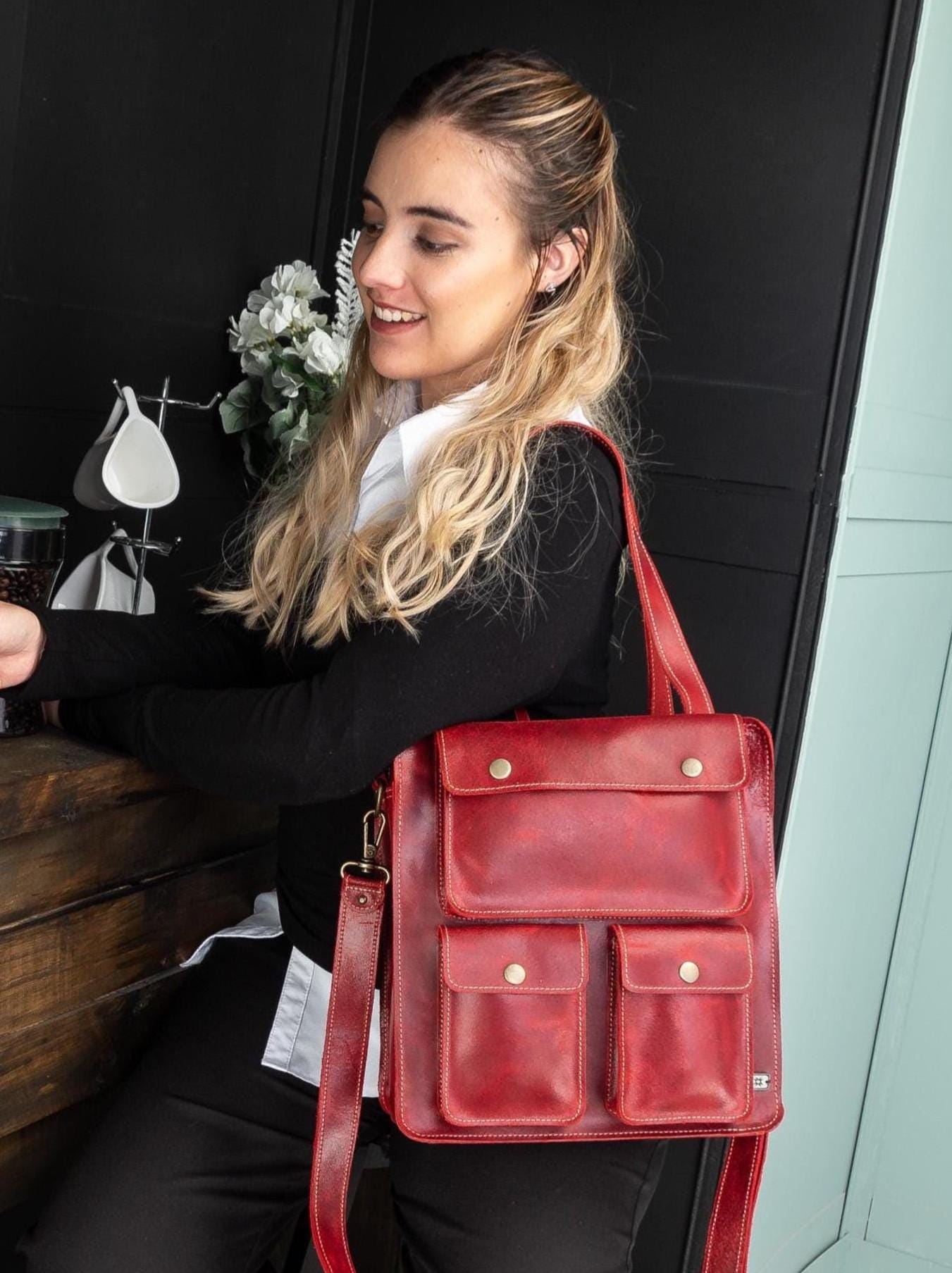 Convertible leather backpack purse for women, red leather work bag,...