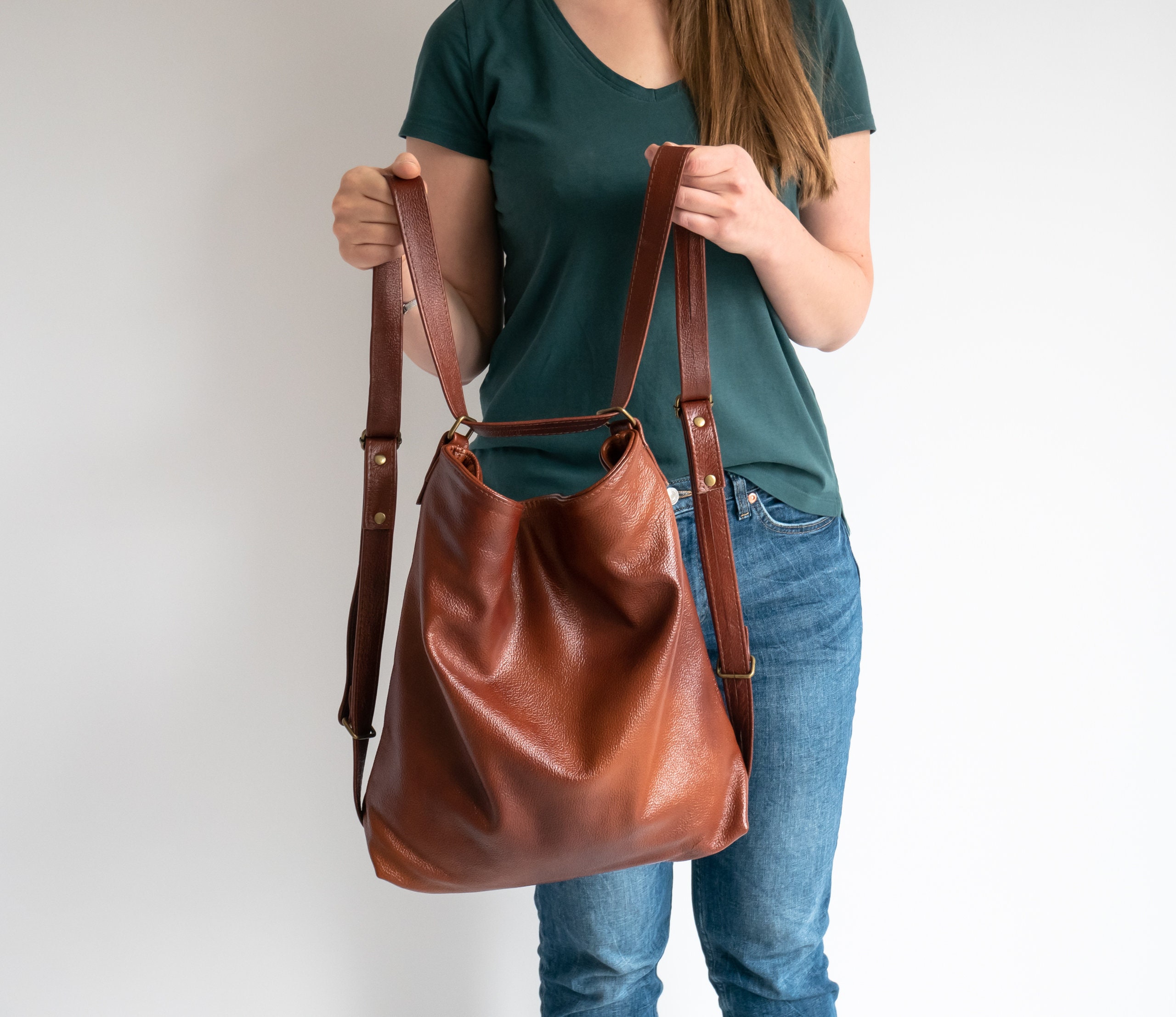 Cognac Brown CONVERTIBLE Backpack, Leather BACKPACK PURSE, Shoulder...