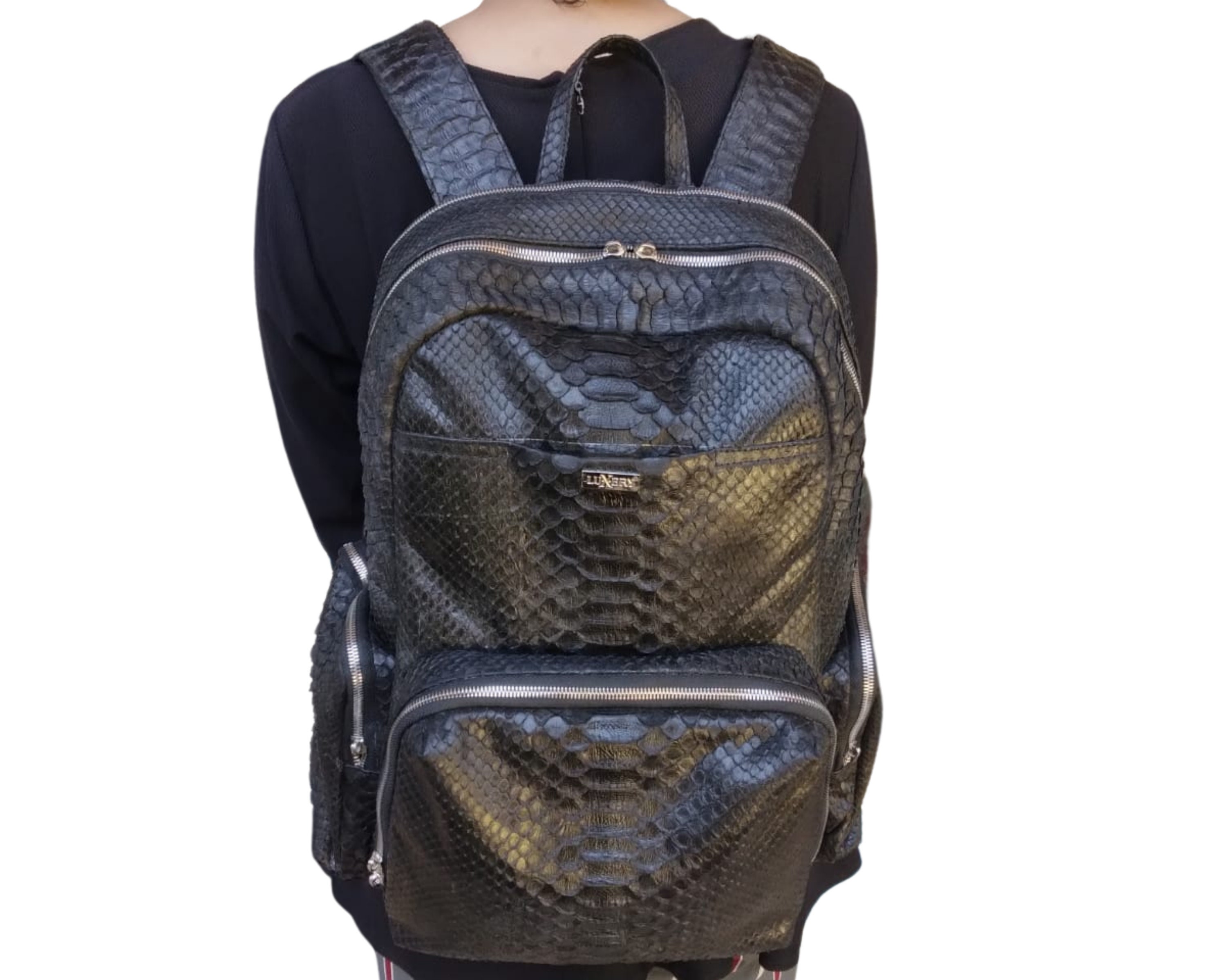 "Travel Leather Backpack, Black Python Snakeskin Back Pack, 3 Outer Zipper Pockets & Laptop...