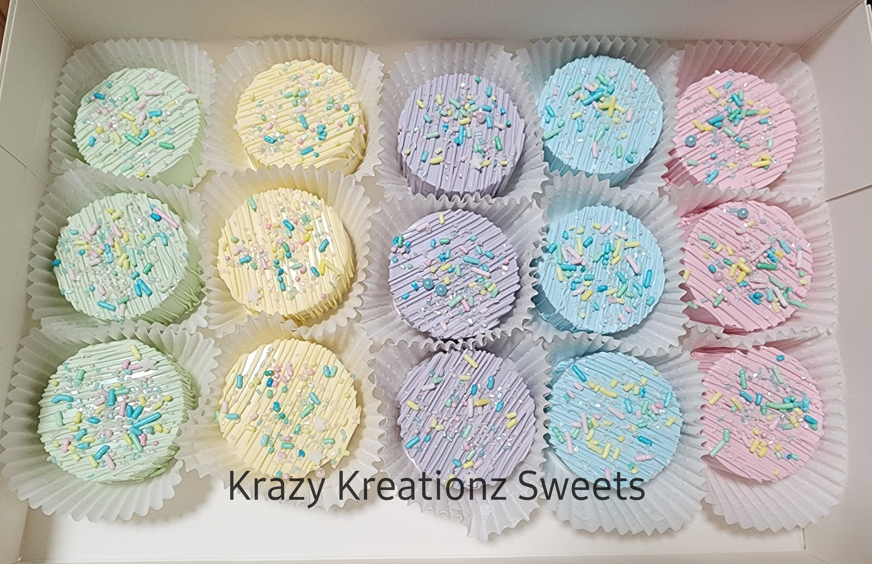 Each order includes 1 dozen individually wrapped pastel chocolate covered oreos Sprinkles may vary b...