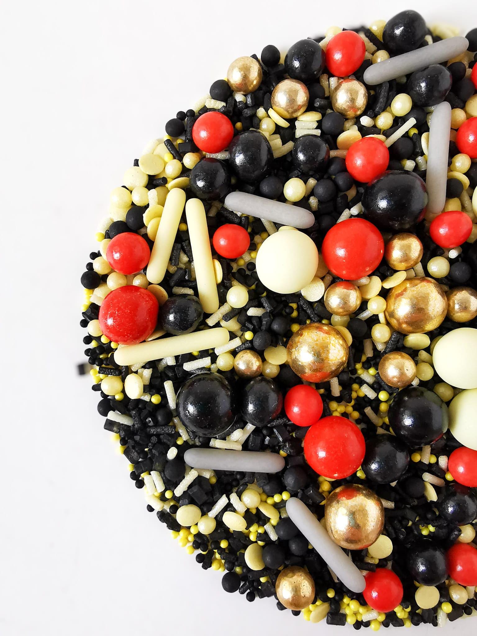 "Add bold colour and energy to your sweets with this Black Red Yellow Gold Sprinkles - perfect ...