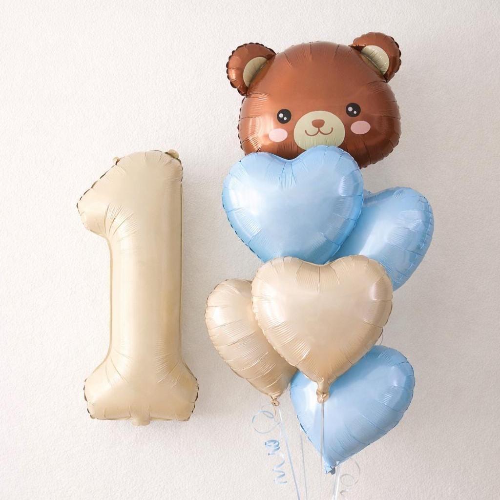 "Bear first birthday decor, bear balloon, bear birthday party, blue balloon, cream number ballo...