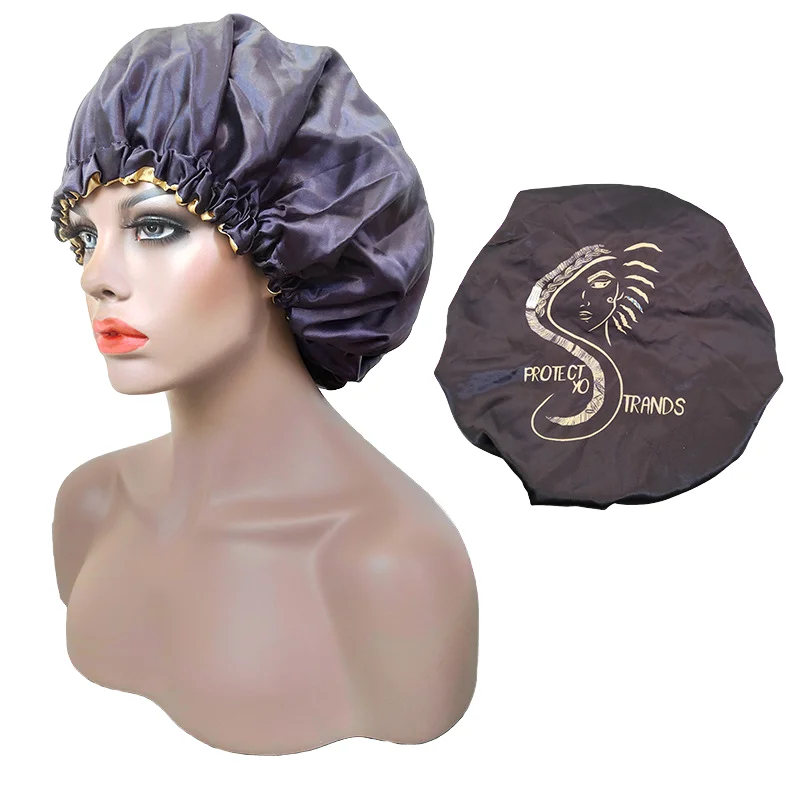 Custom Logo Bling Black 100% Silk Satin Adjustable Hair Bonnet Wome...