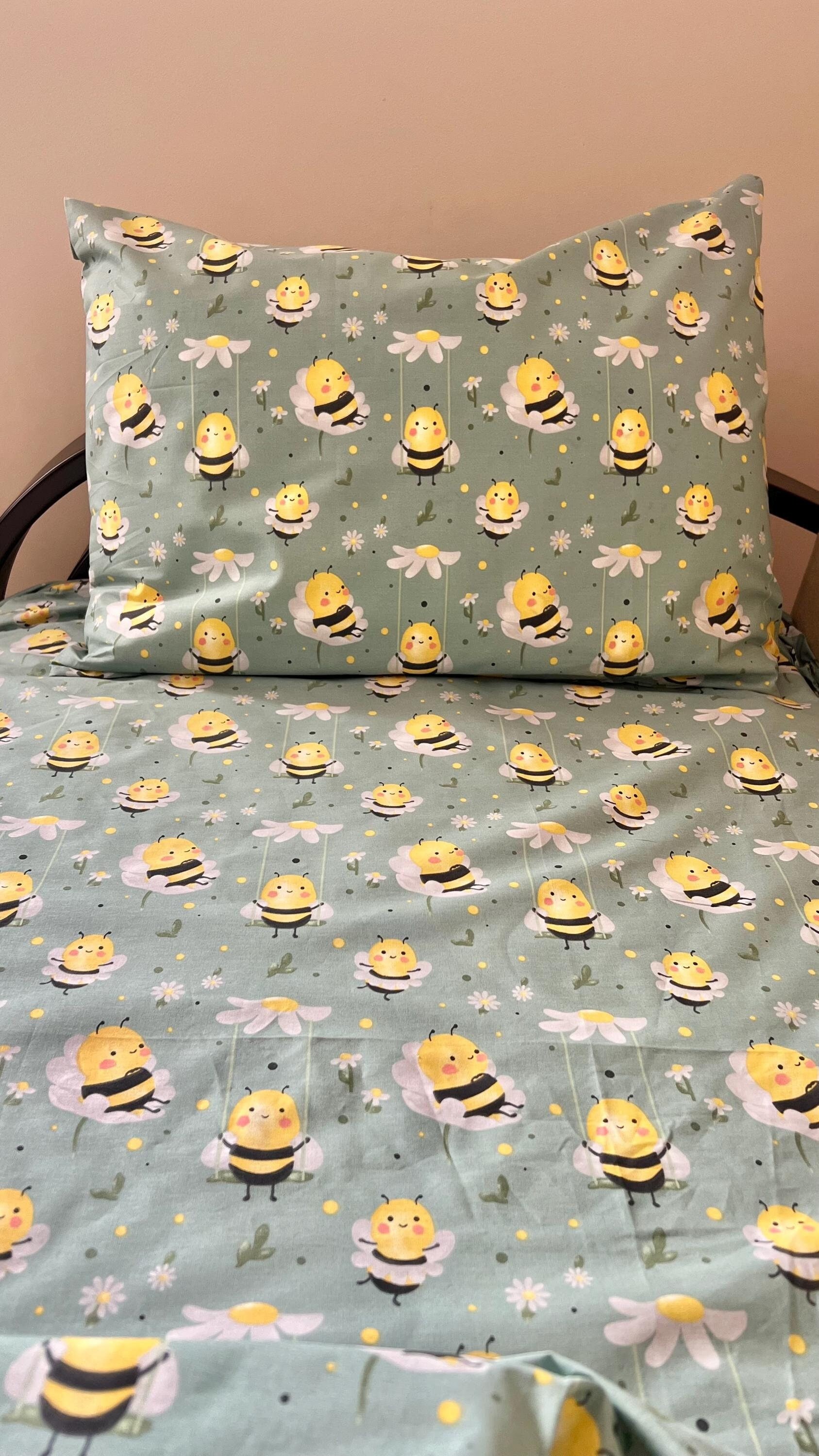 Green bees cotton pillowcase, green bees cot bed set, green bees ki...