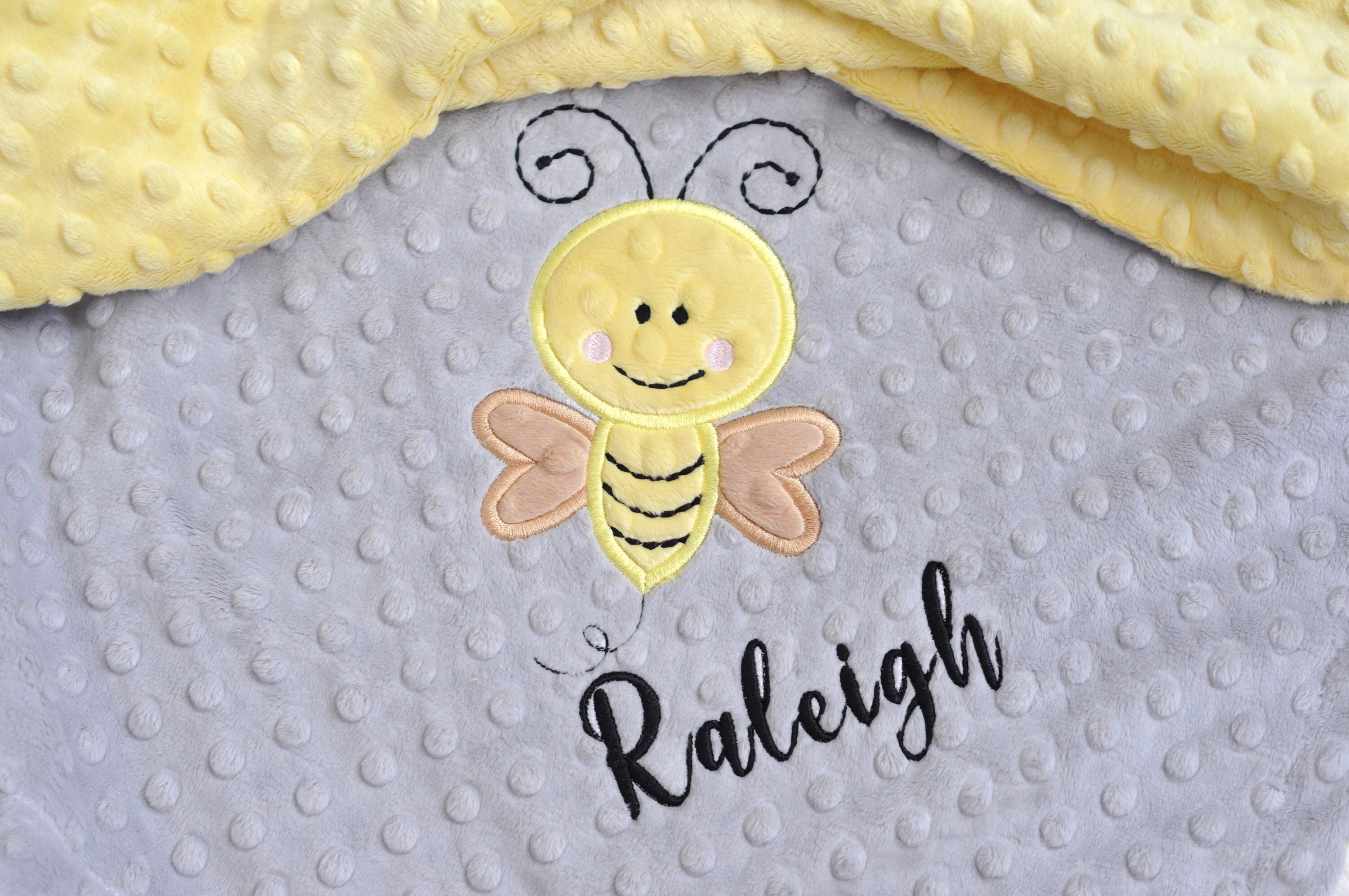 "This lovely minky baby blanket comes with Personalized Bee Appliqué and with one or two...