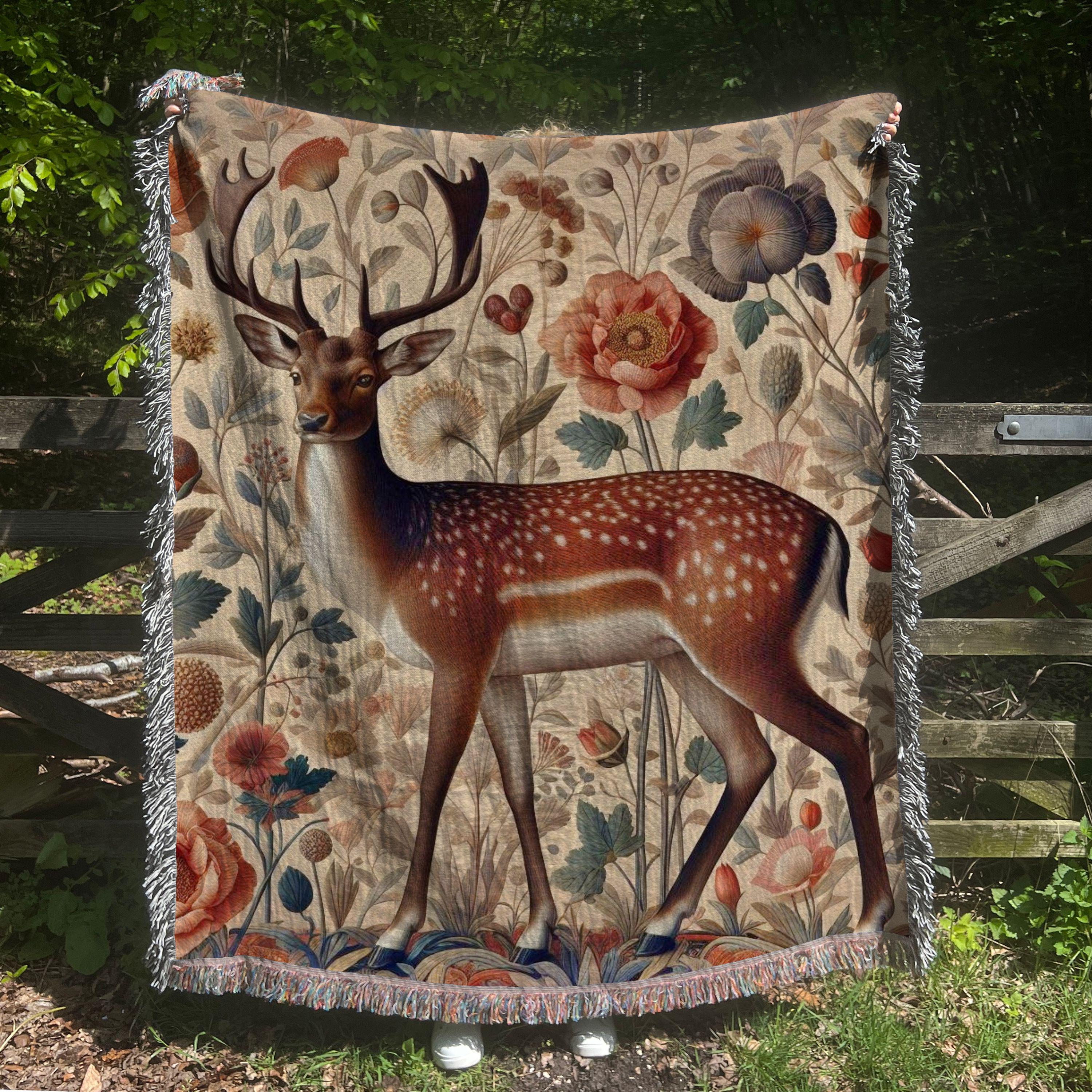 This Floral Deer on Botanical Background Woven Blanket is a beautiful addition to any nature lover's...