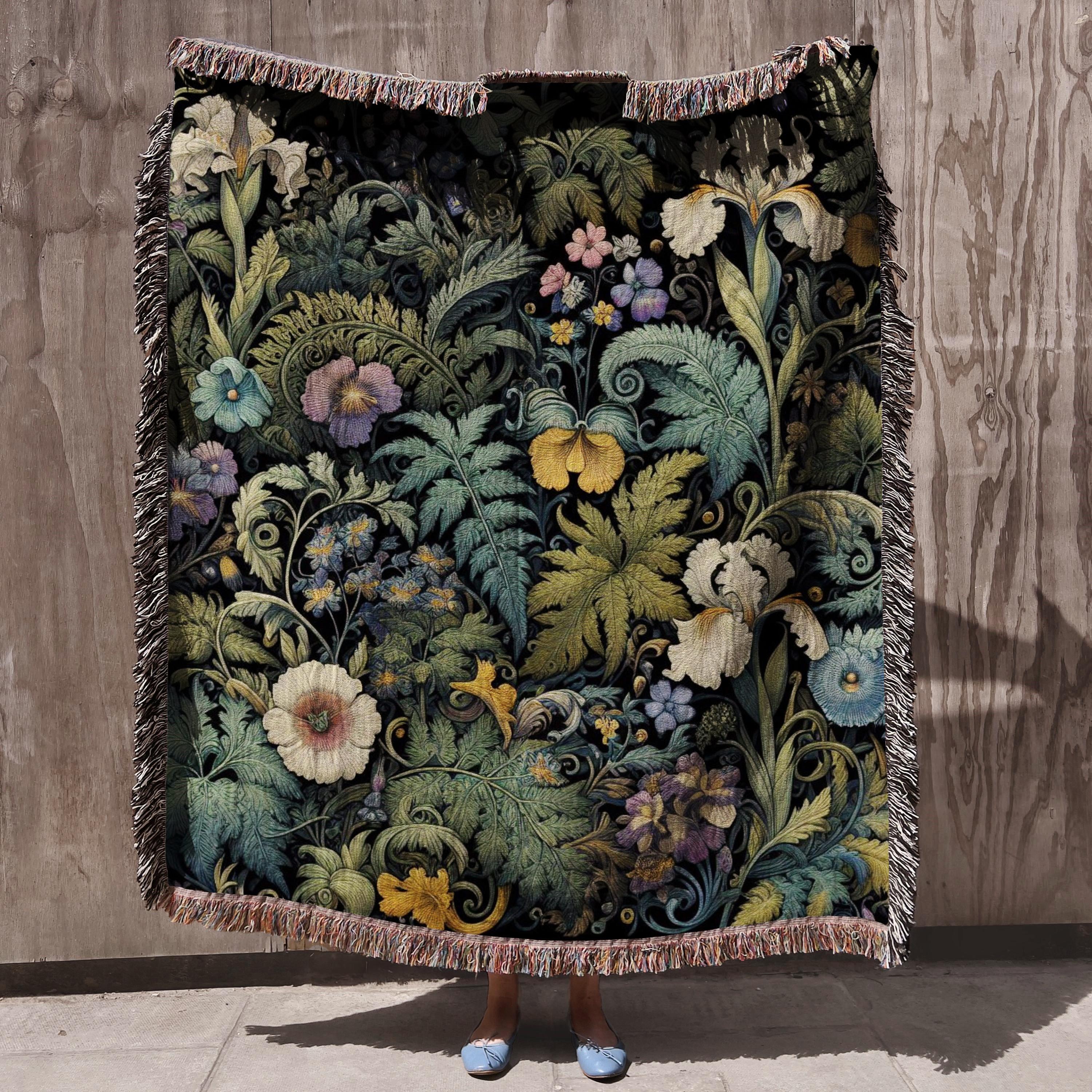 Dark Cottagecore Woven Blanket 100% Cotton Rug Ferns and Irises Wov...