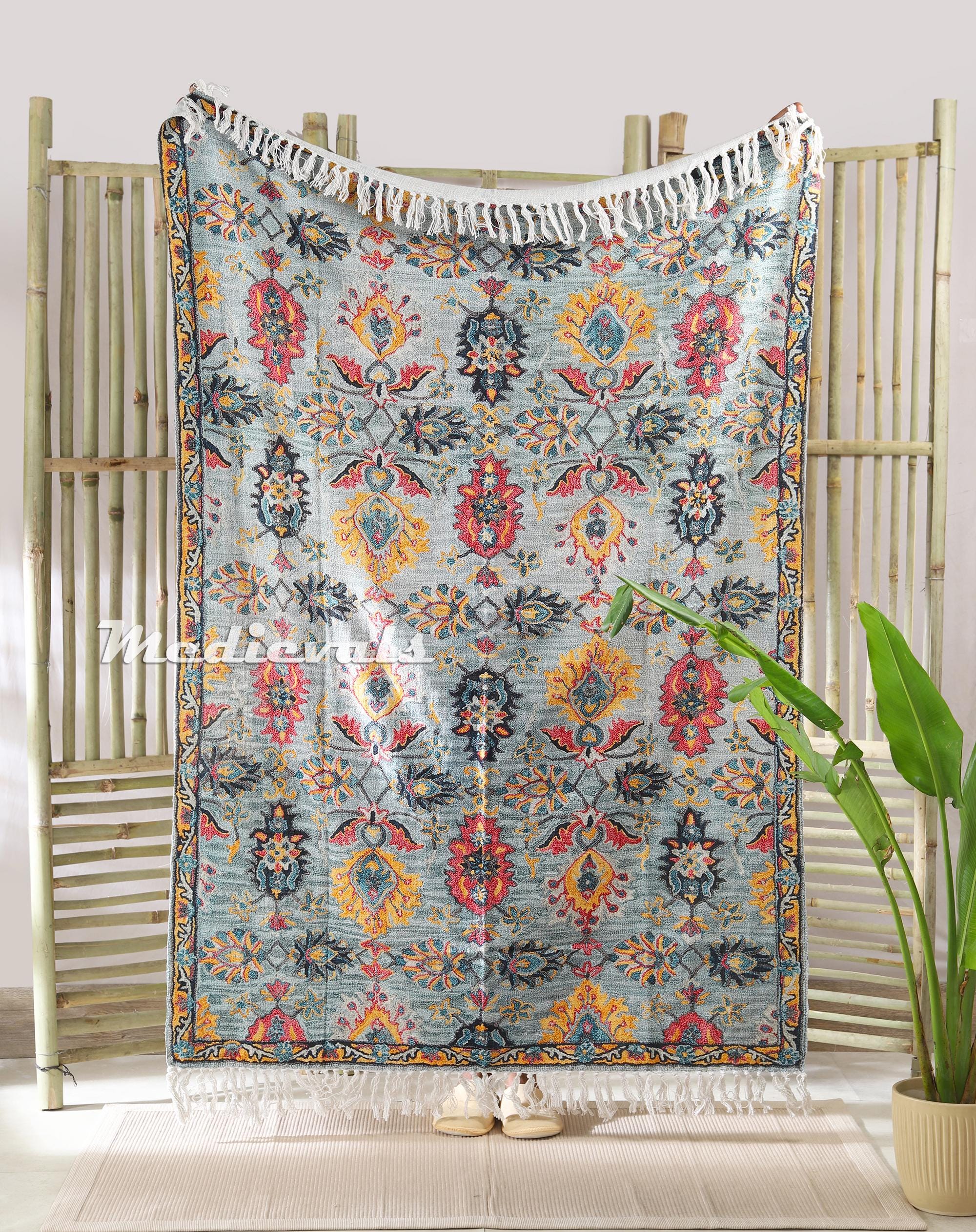 Floral Botanical Kilim Printed Vintage Rug Style Throw Blanket, Boh...