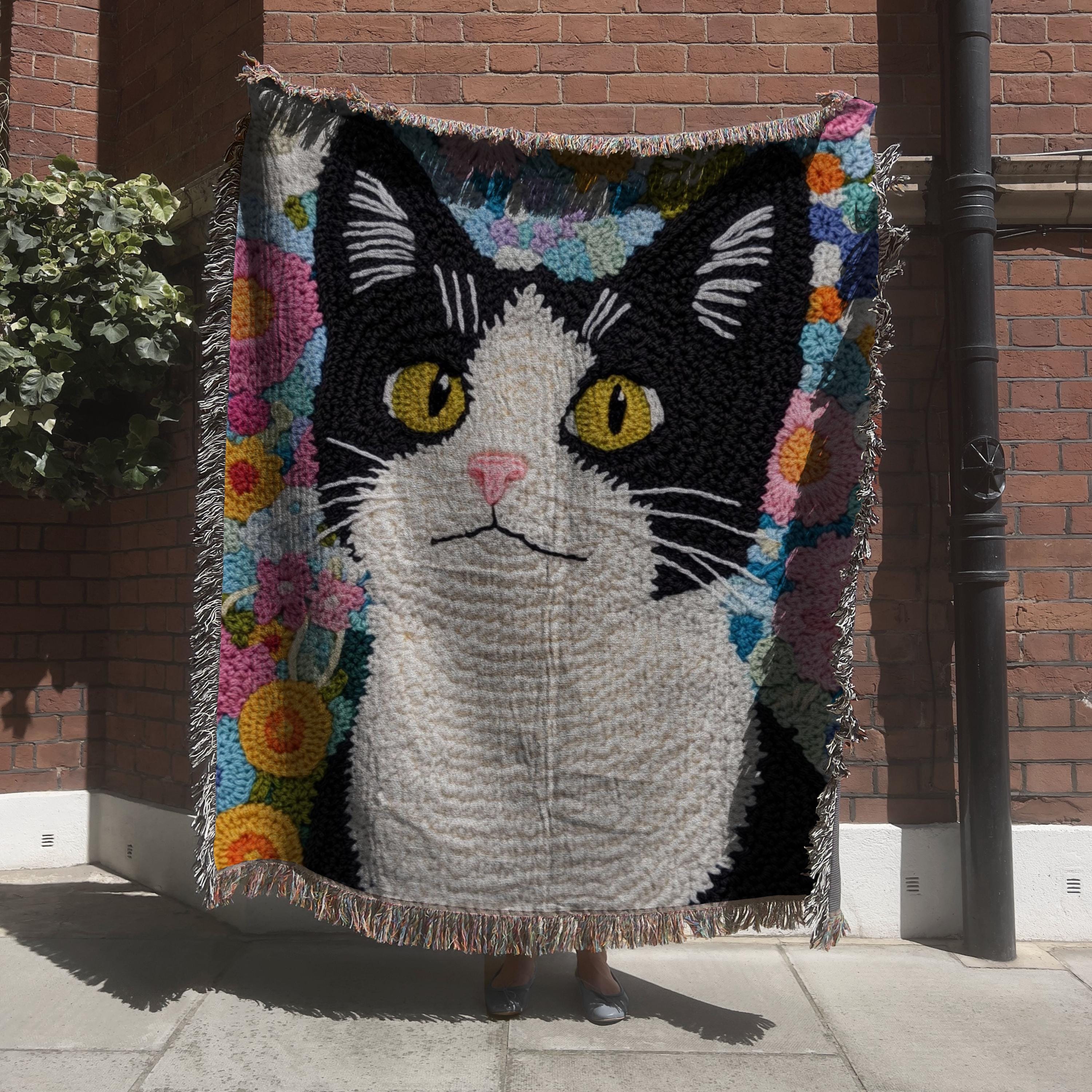Tuxedo Cat Blanket, Woven Throw Blanket, Cat Lover Gift, Crochet Ca...