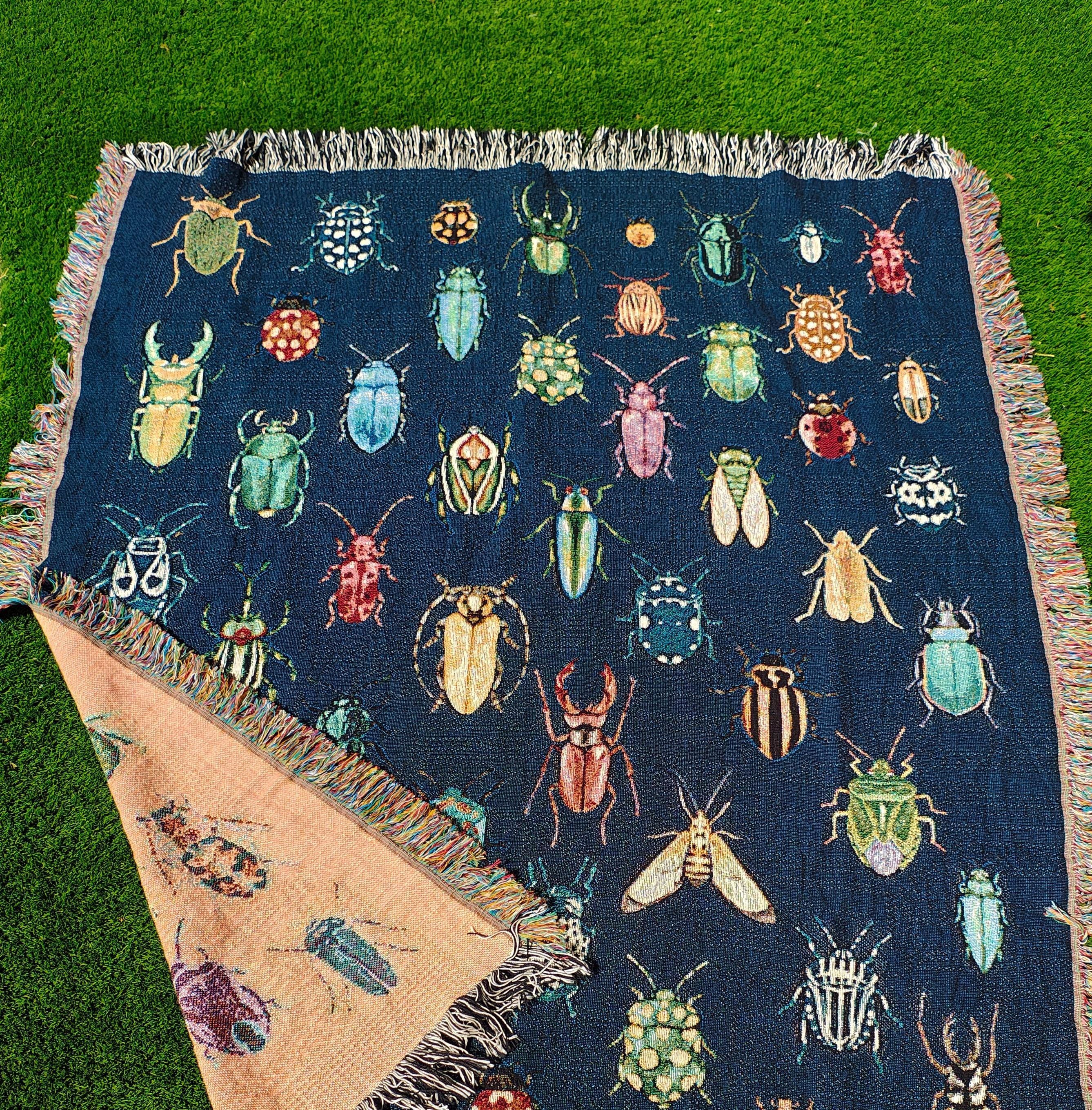 Colorful Beetles Woven Blanket 100% Cotton Rug Vintage Bugs Home De...