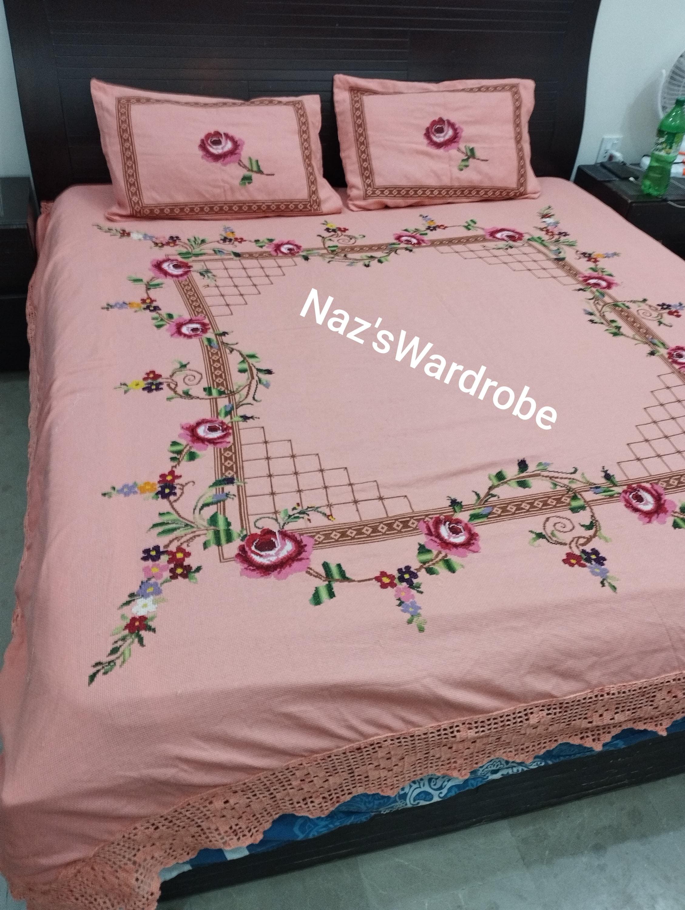Handmade Cross Stitch Bedsheet with Pillow Covers |hand Embroidered...