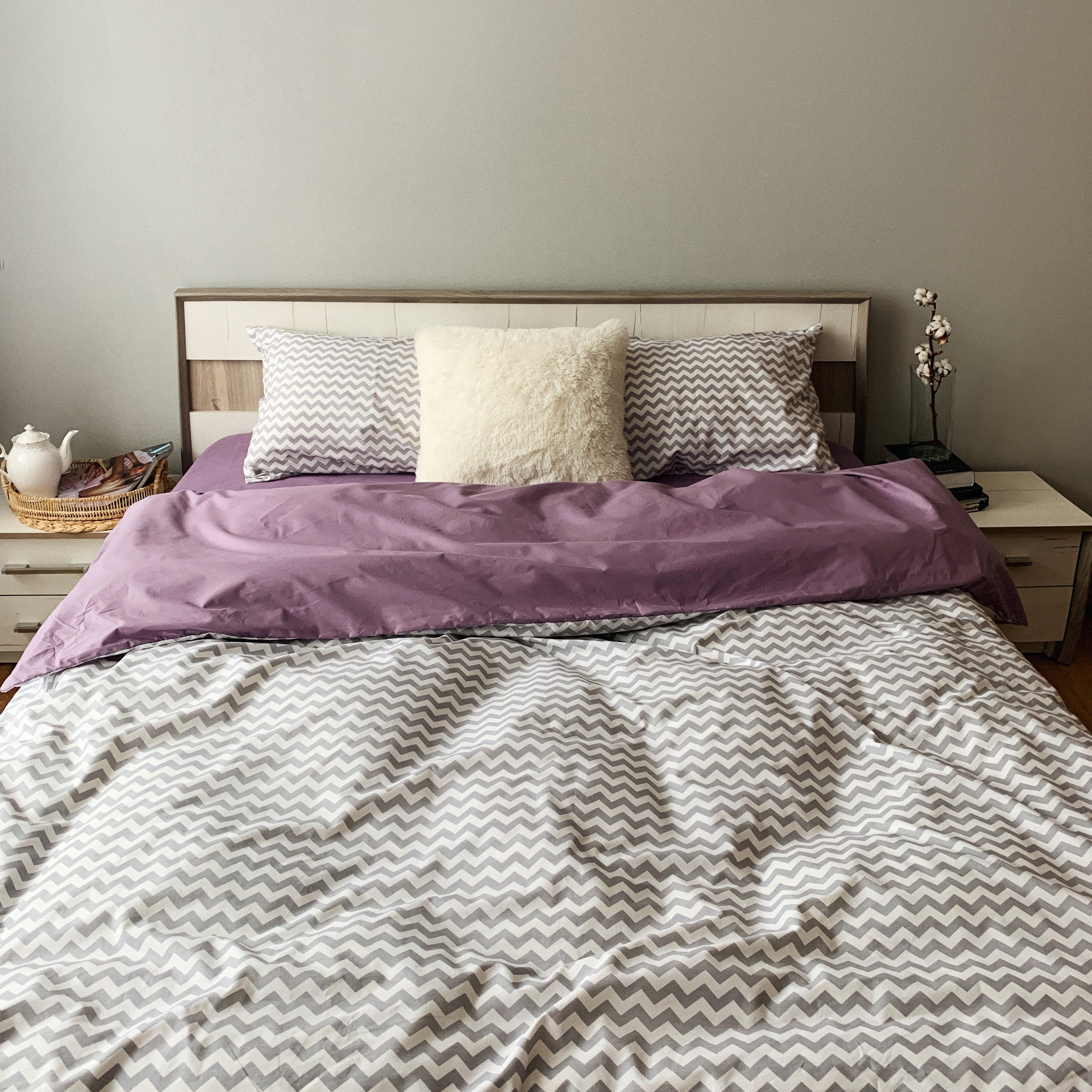 Natural Cotton Double-sided Duvet Cover in Dark Purple and Gray Zig...