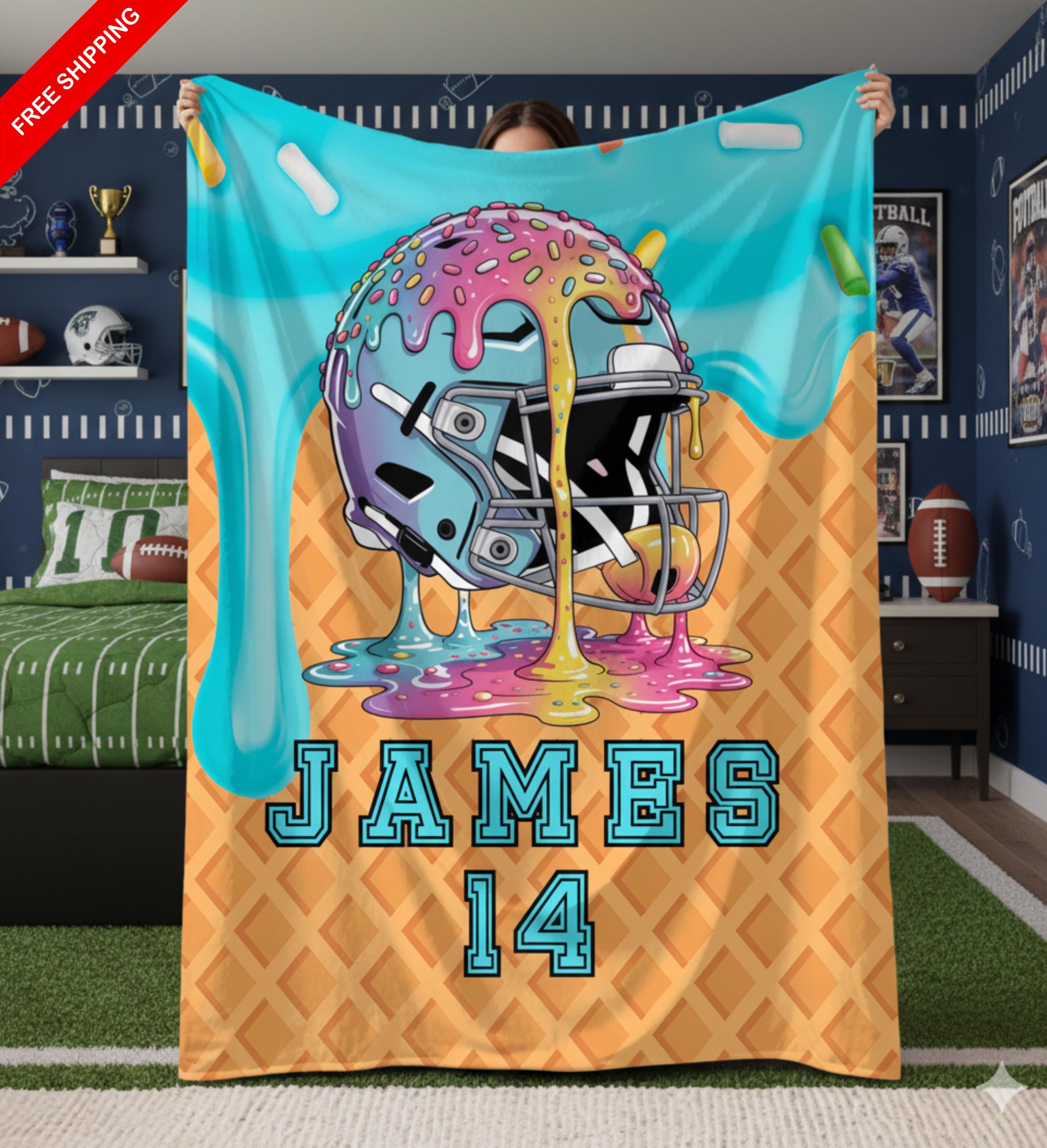"Personalized Ice Cream Drip Football Blanket - Custom Name Football Bedroom Decor - Cozy Footb...