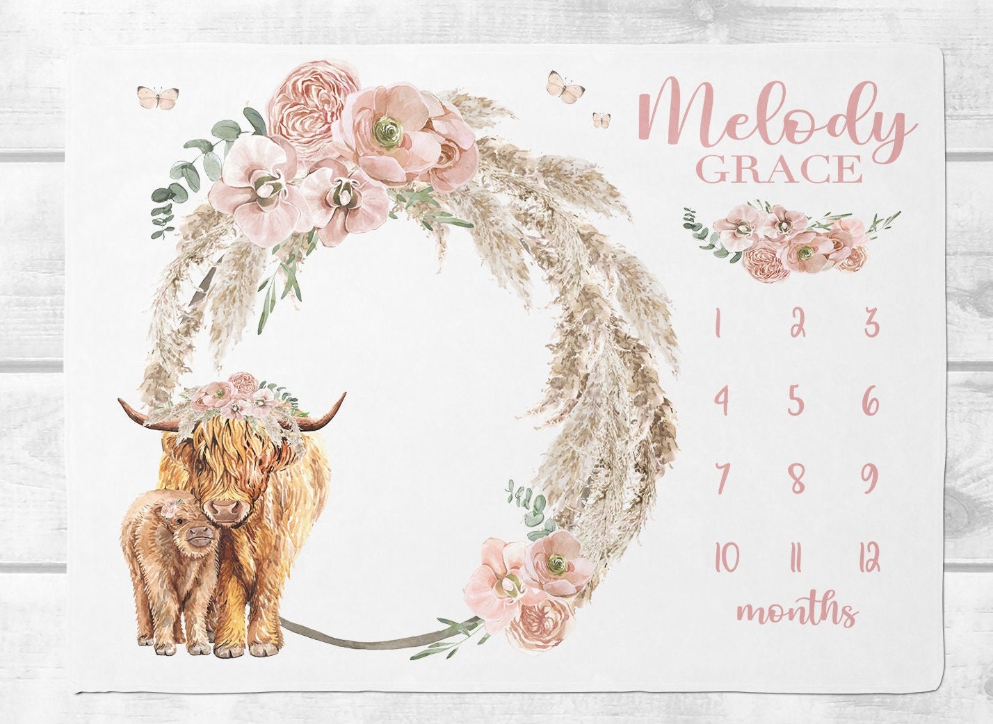 Baby Girl Highland Cow Milestone Blanket, Boho Floral Highland Cow ...